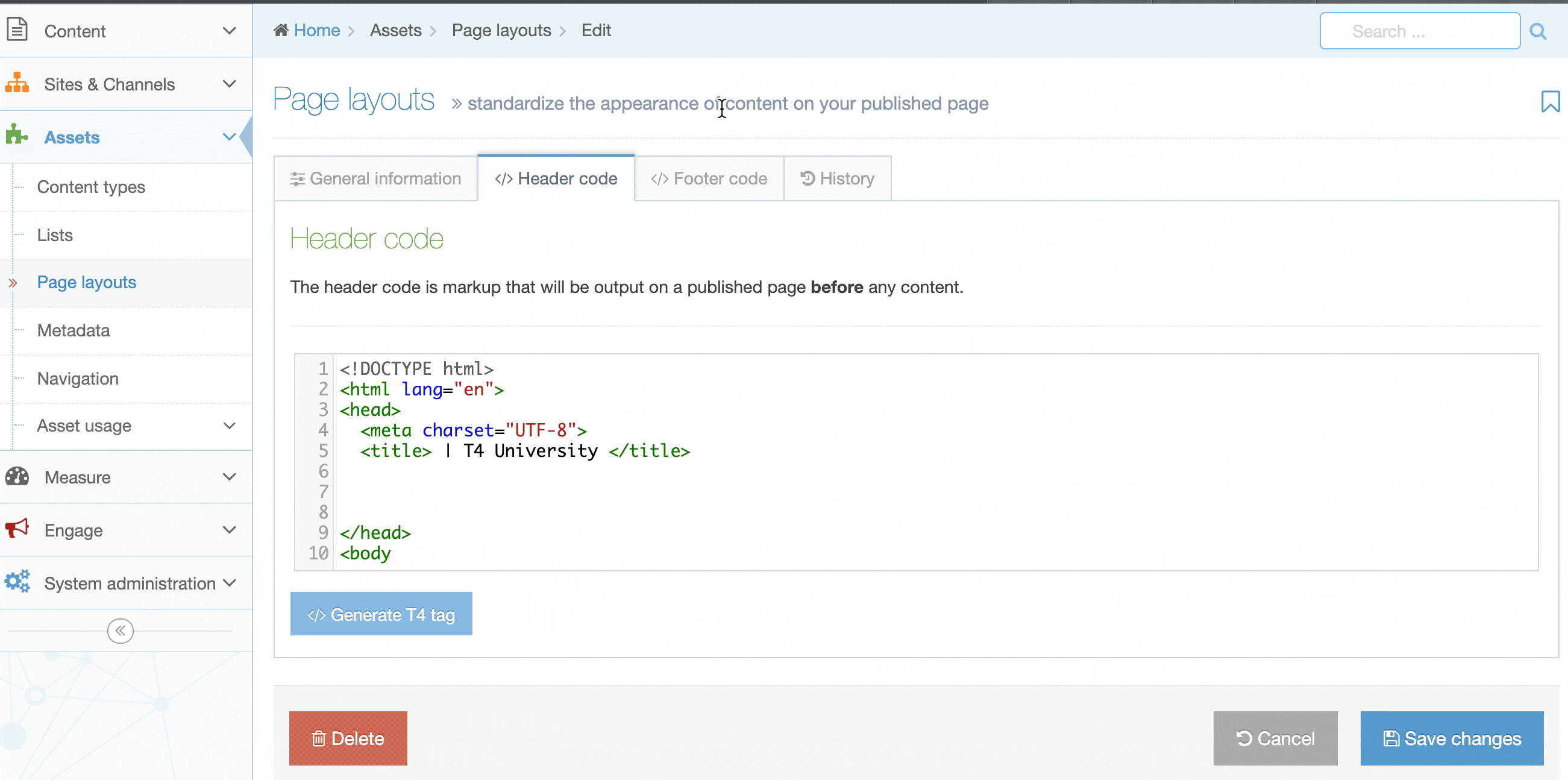 Typically, the title tag is in the Header Code of the Page Layout and uses the T4 Title Tag to generate the name of the current Section or Content Item. The published title can then be appended with the name of the organization to give the link a context in search results or when shared on social media, e.g., "Study with us | T4 University". This is the most straightforward approach and ensures that all pages have a title tag without any additional effort by users.