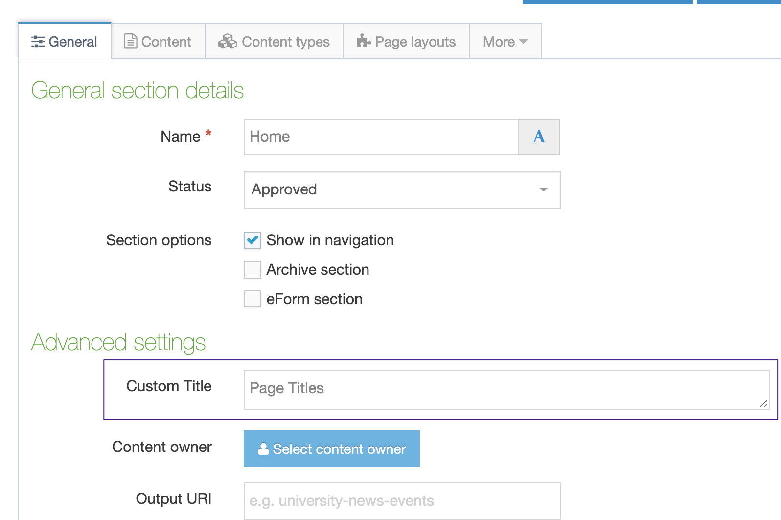 Search Engine Results Pages display the first few words (50-60 characters) of the title. Still, if the name of the current Section is very long, or doesn't make sense out of the context of the Site Structure, you might want to let your users use a custom title. To prevent publishing pages with blank titles, the title should continue to use the name of the current Section or Content Item if the custom title is left blank.