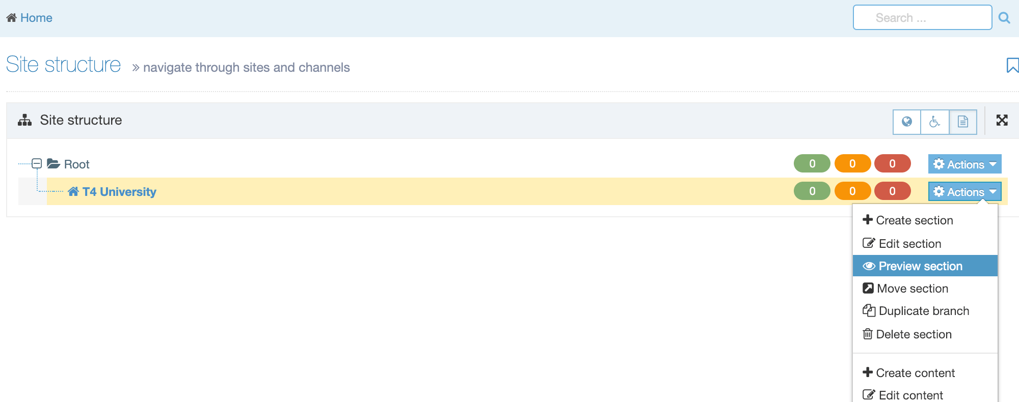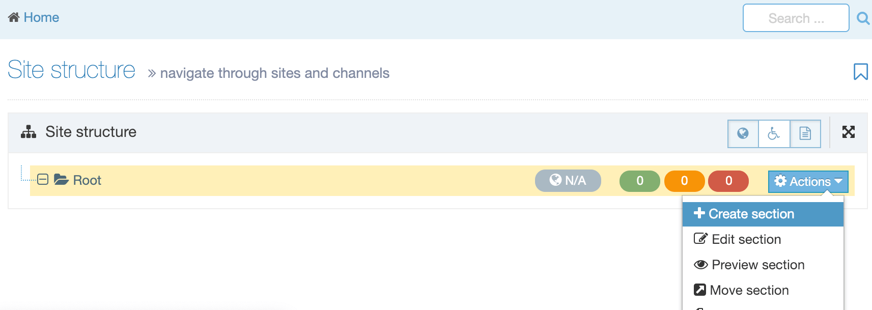 If your Site Structure is empty, you’ll see the Root Section. You’ll be adding the Branch that makes up your site below this Root Section. To do this, select the Action Menu to the right and select Create Section: