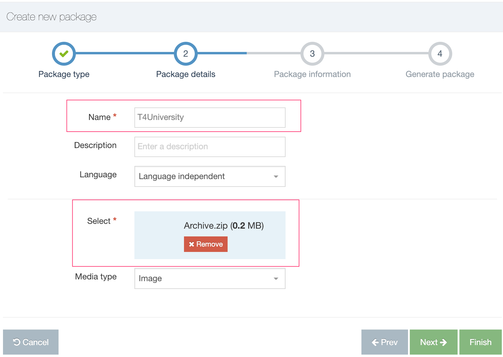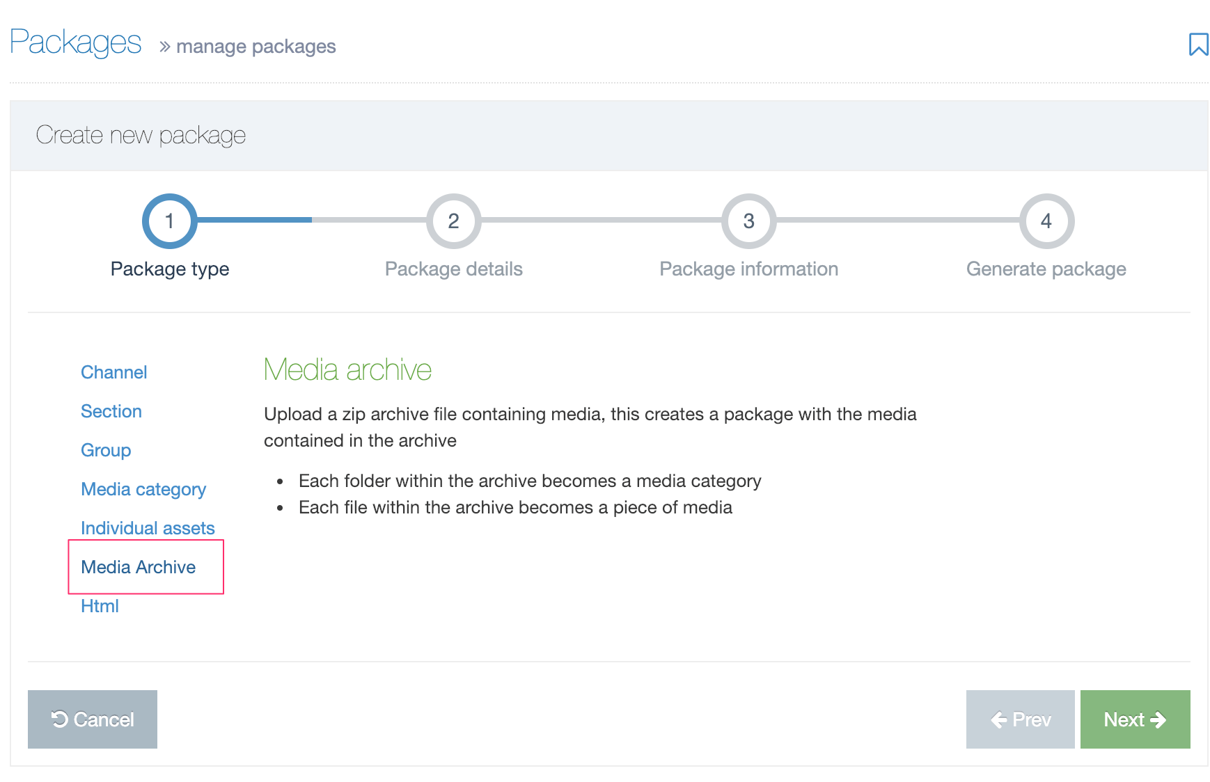 The type of Package we want is the Media Archive Package, select it and hit Next: