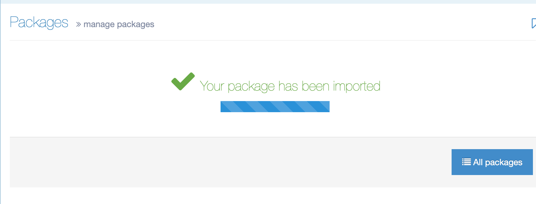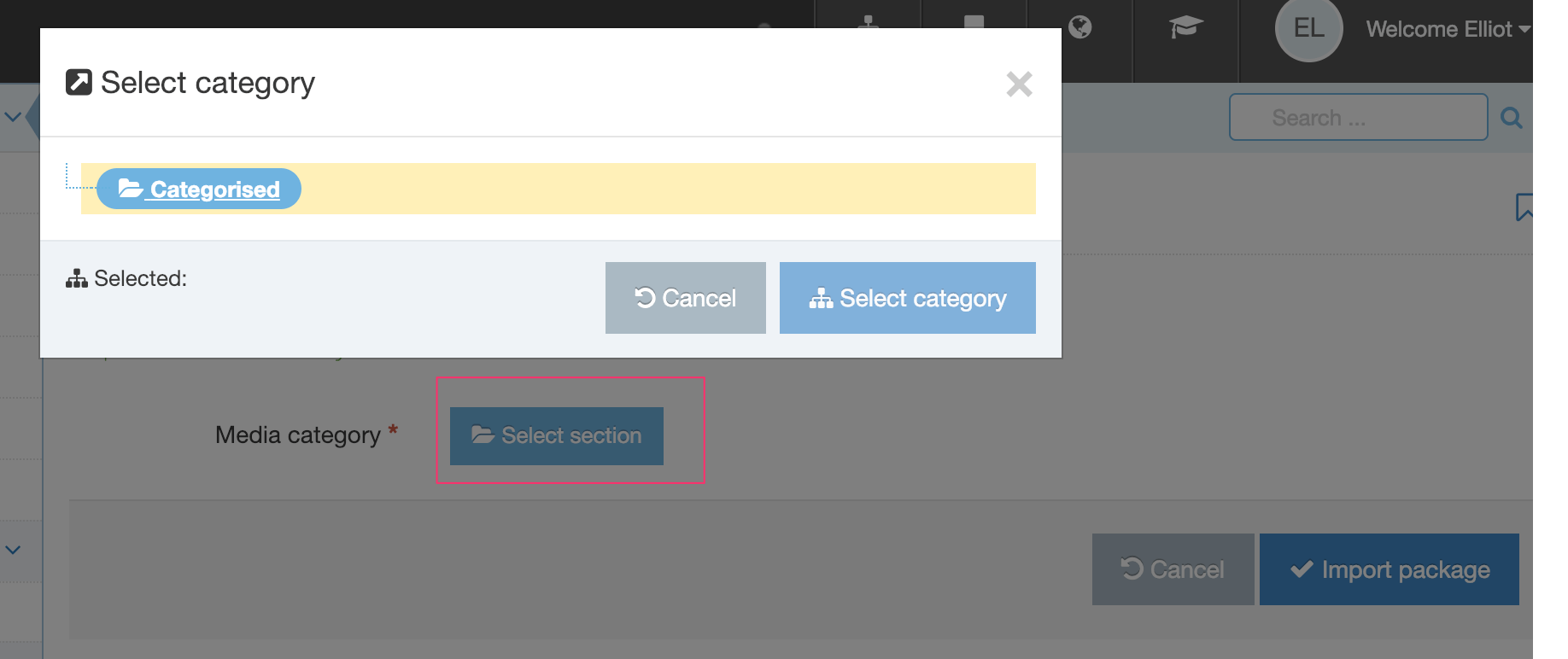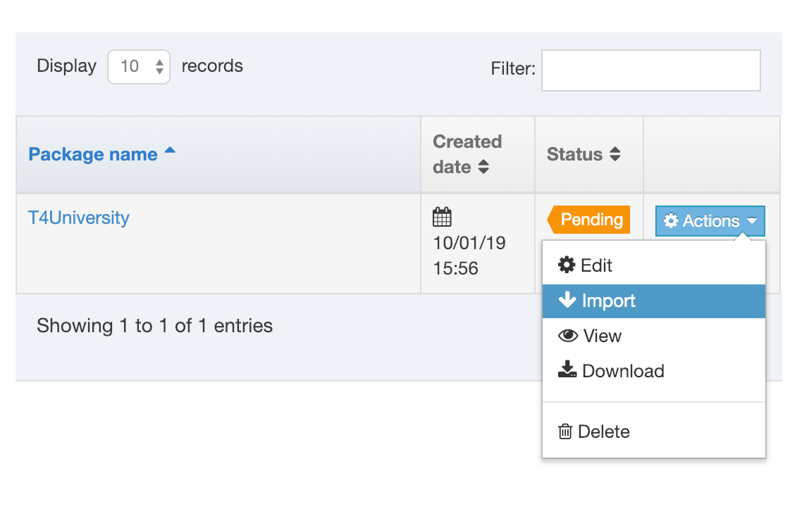 On the next screen, you will see the Package you have just created. From the Actions menu, select Import, to import it into the Media Library.