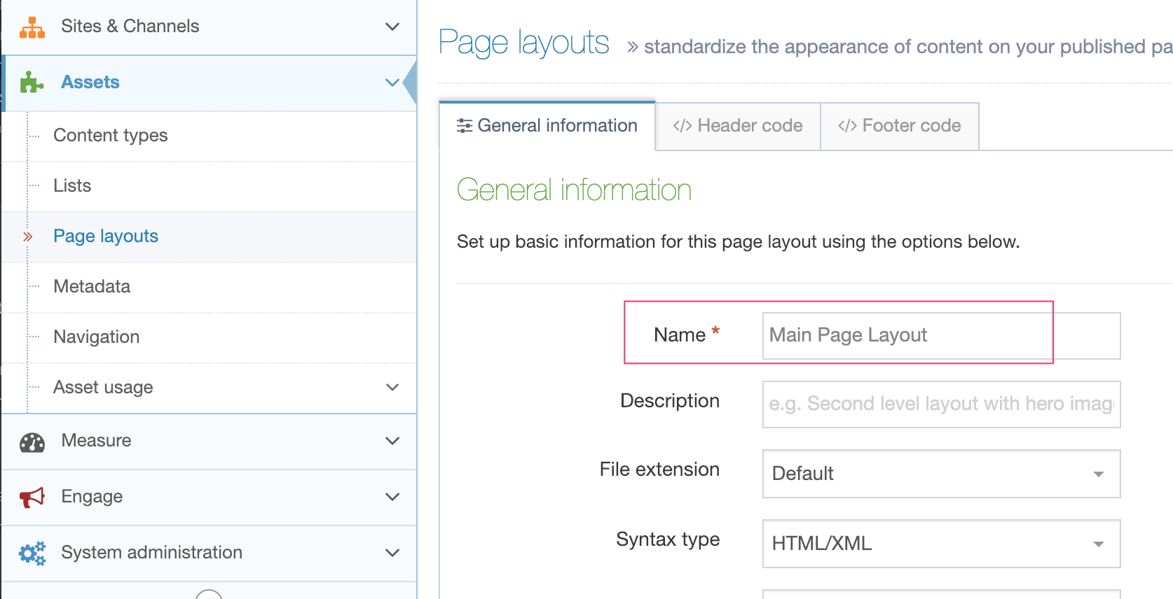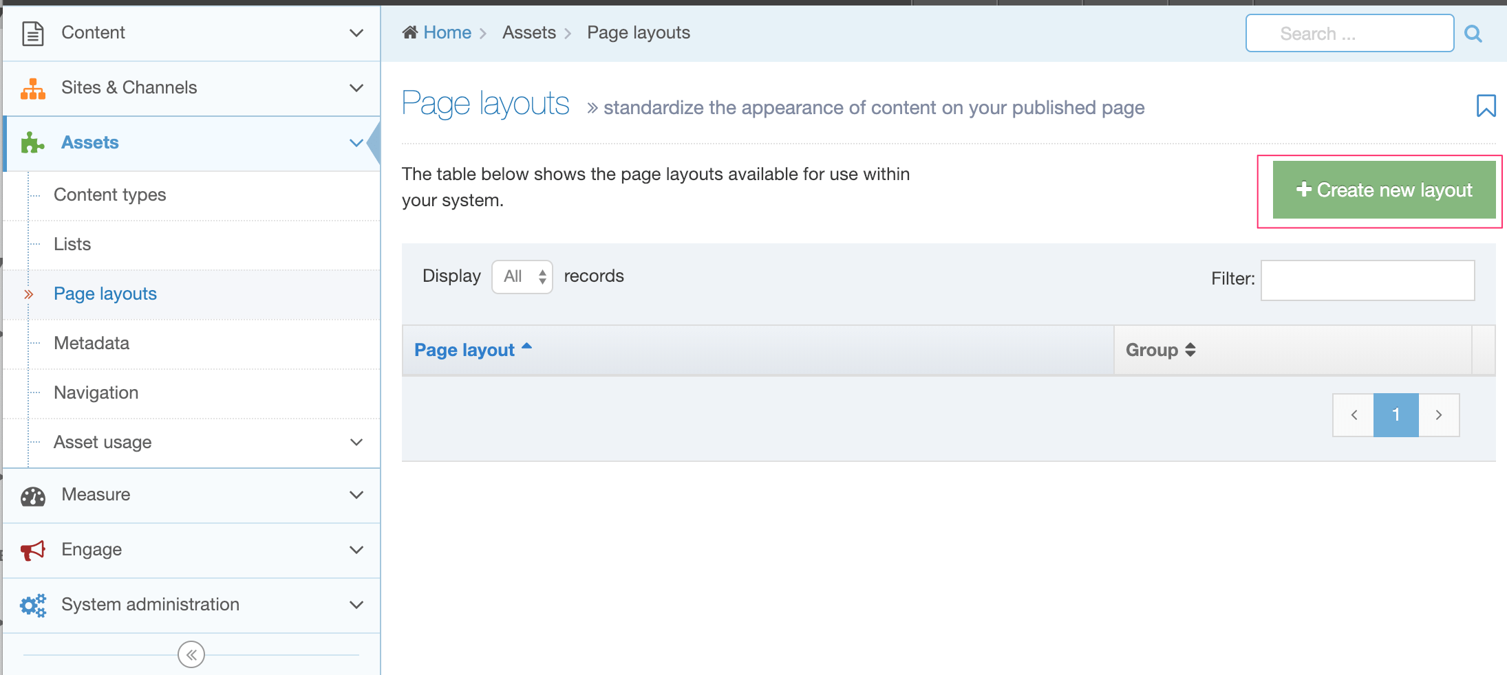 Let’s create the Page Layout for our page. Go to Assets > Page Layouts and create a new Layout: