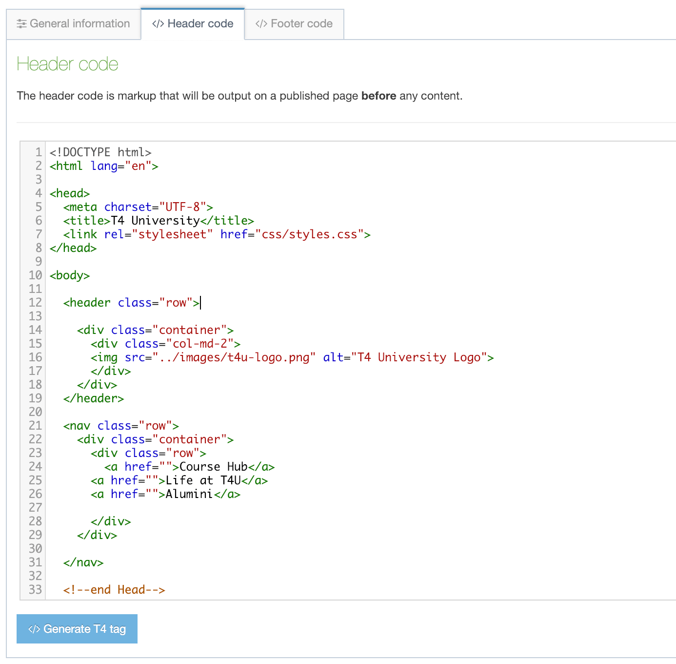 You might notice that the "hero" uses a background image that we must add to our stylesheet. Let’s generate the T4 Tag for it here.