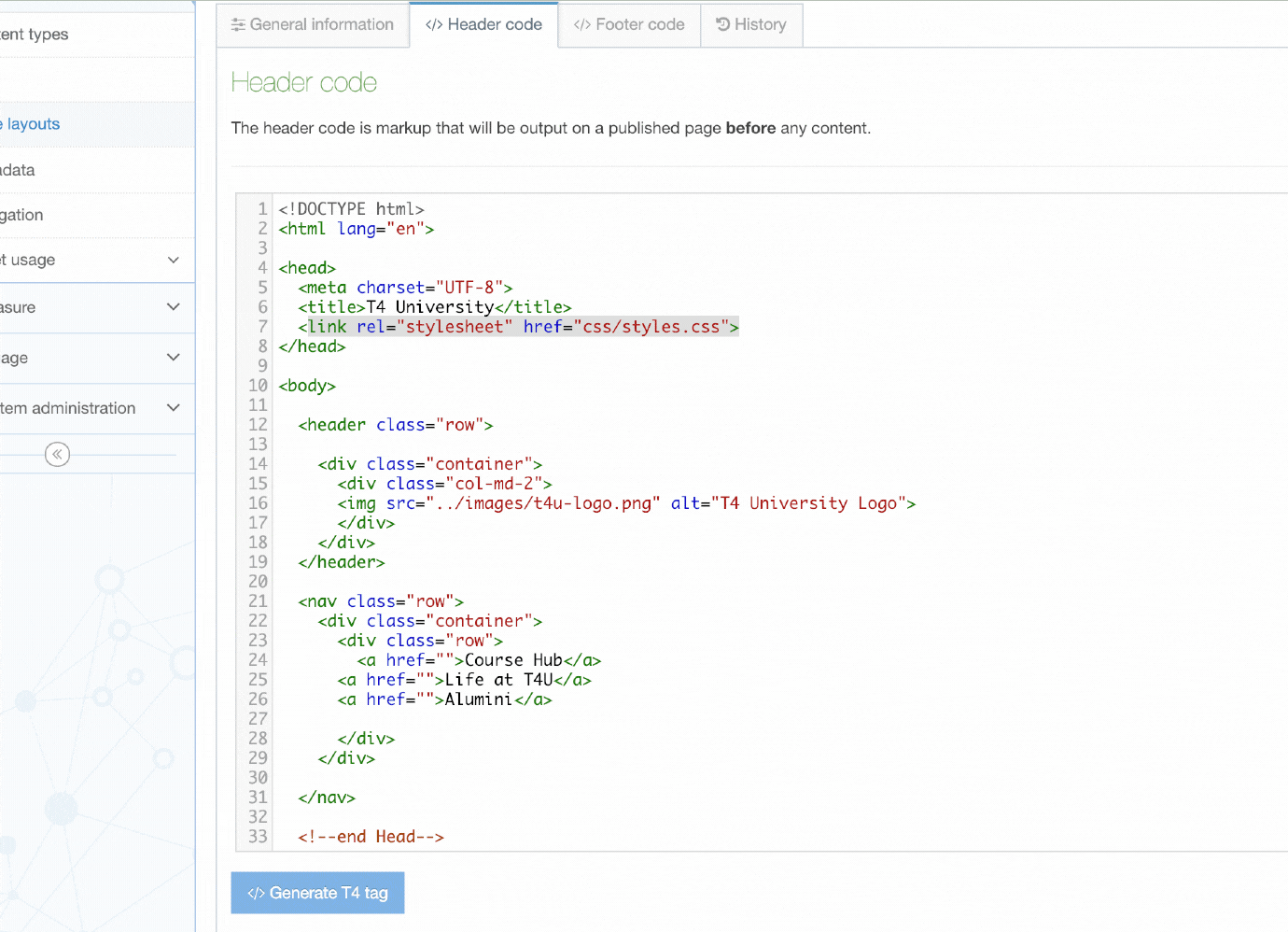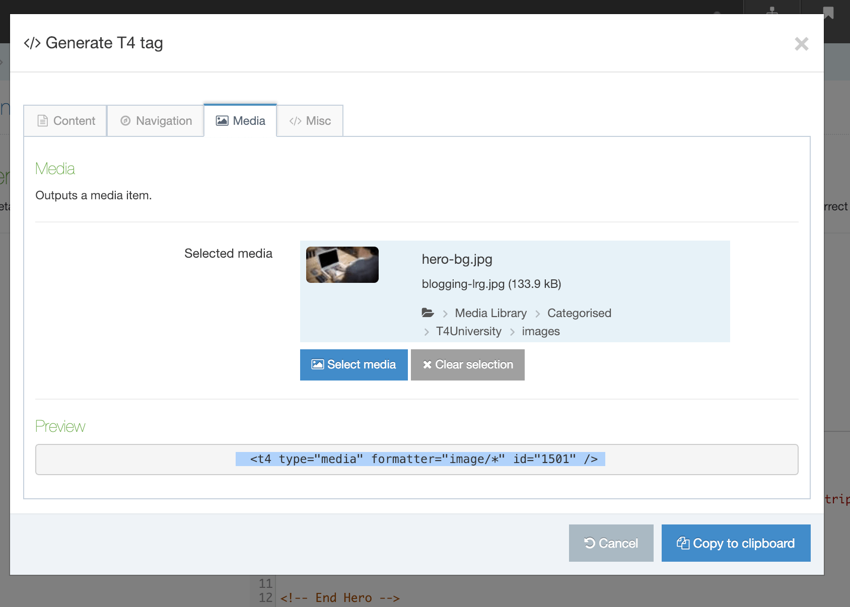 Select Generate T4 Tag and this time select the Media tab, navigate to the image in the Media Library named "hero-bg.jpg" and copy the T4 Tag to your clipboard.