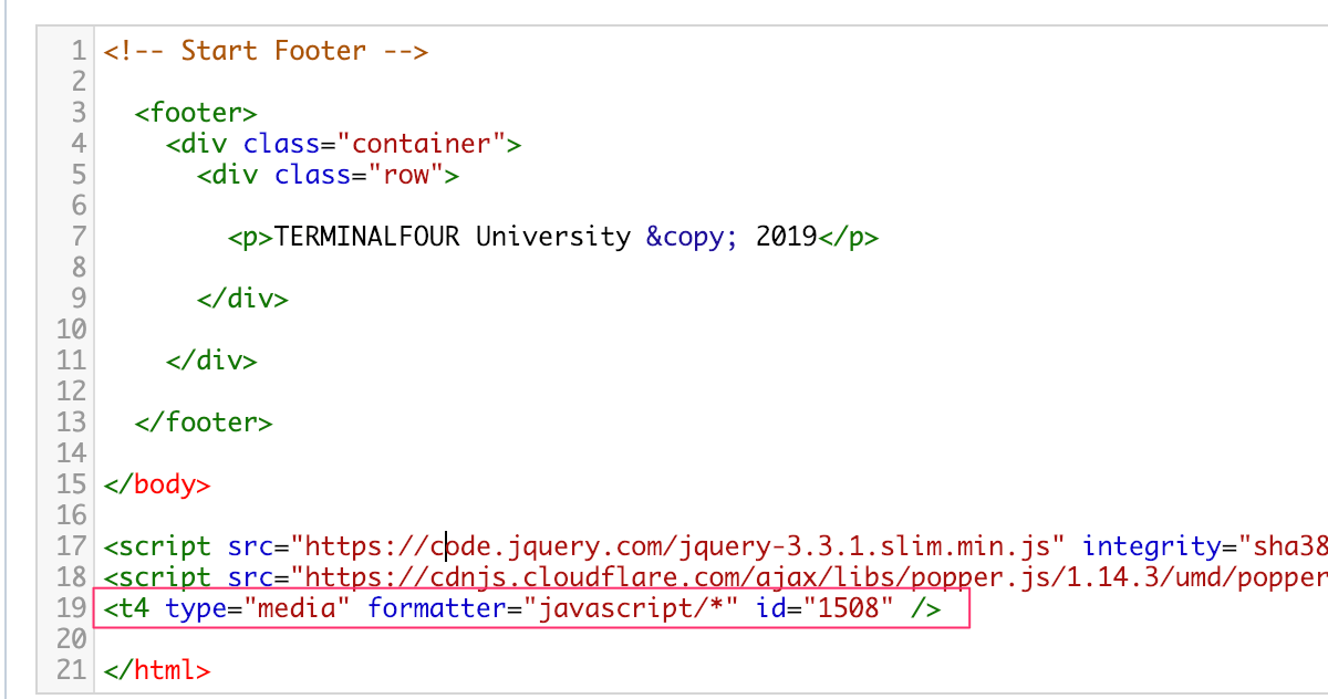 Paste into the box in the Footer tab. Here, I’ve replaced the JavaScript file paths with a T4 Tag referencing the same file in the Media Library: