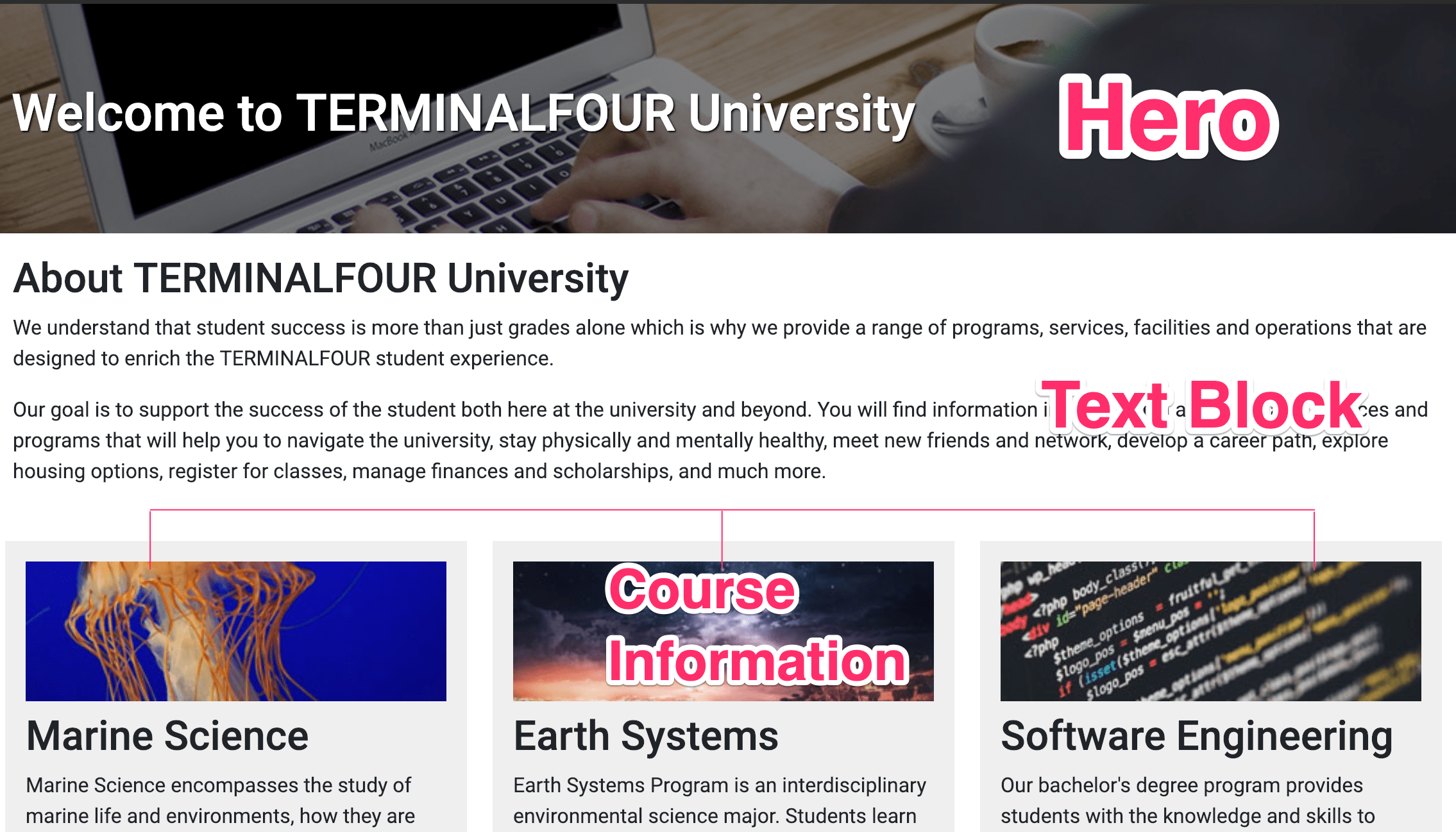 Content Types are structured containers for content. For instance, content like course information will have a structure – a title, main text, and an accompanying image. Because each course info item we create is made upon all or some of the those, we’ll create a Content Type that features those Content Elements.