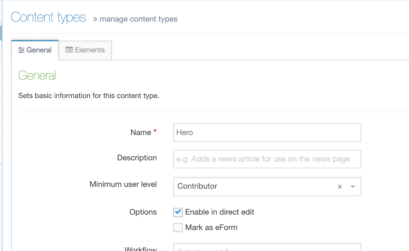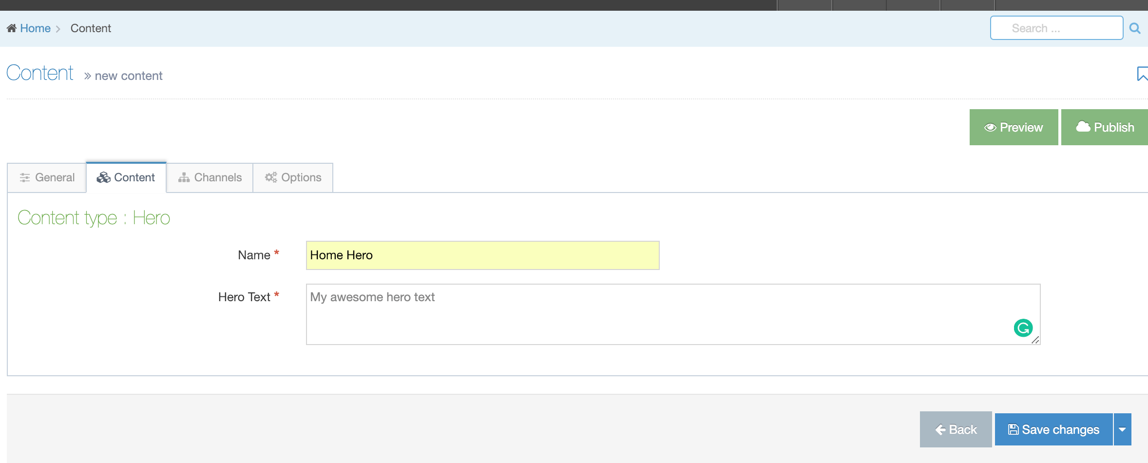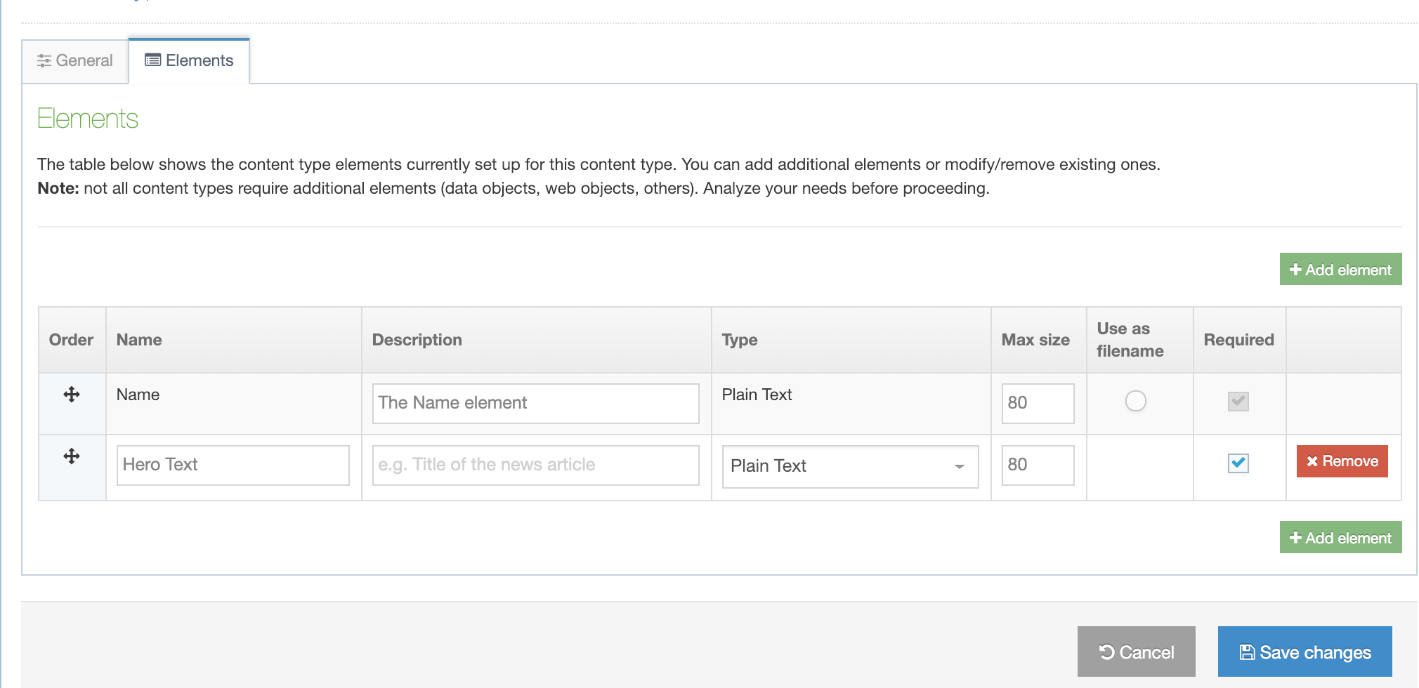 We’ll need to add the Elements to the Content Type. In this Content Type, we add just one plain text Element which we will call "Hero Text":