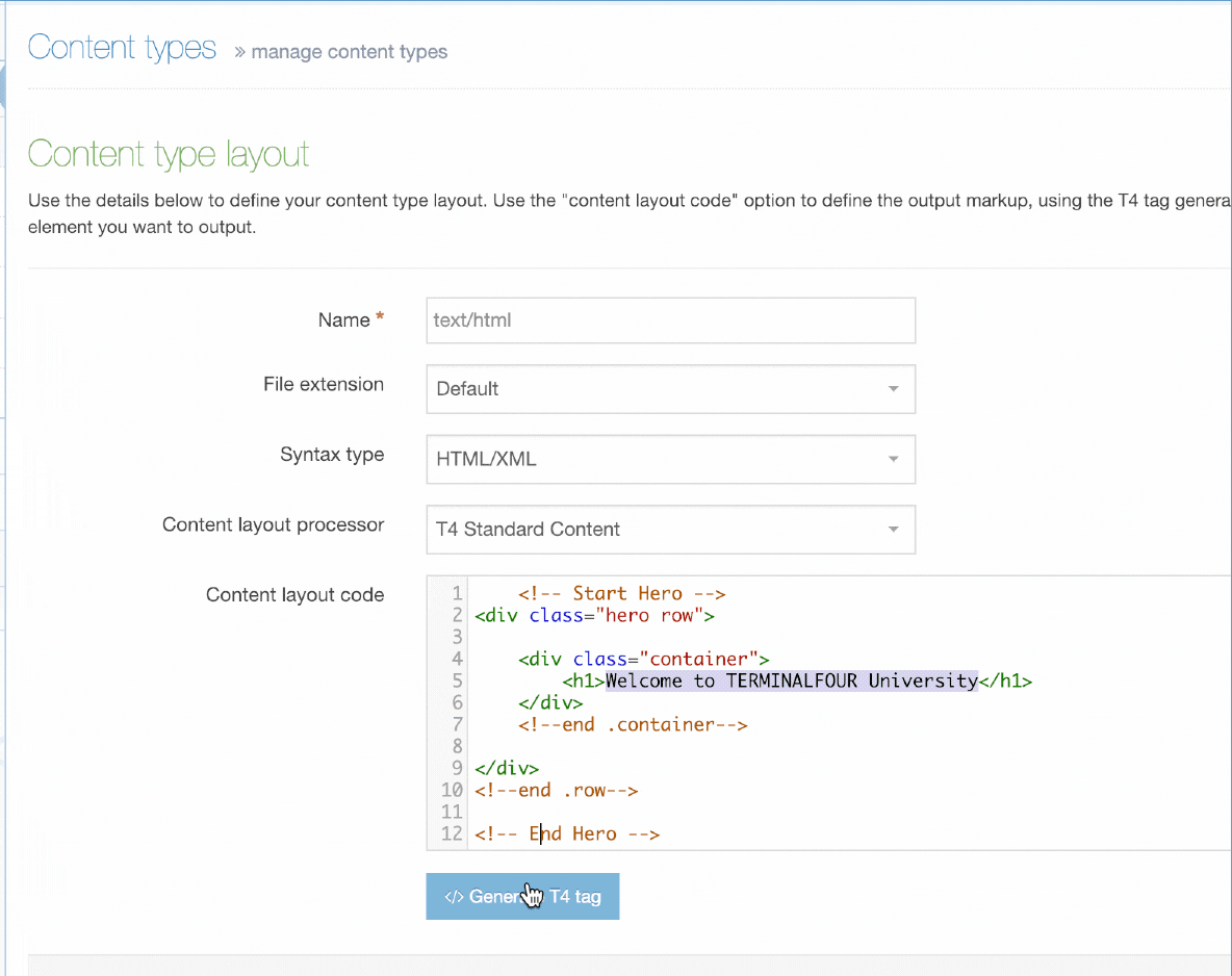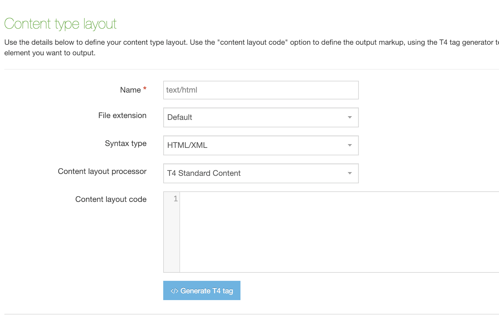 Because we want the heading replaced by text from the Content Type we will generate a T4 Content Tag that will take the text from set in the Content Type: