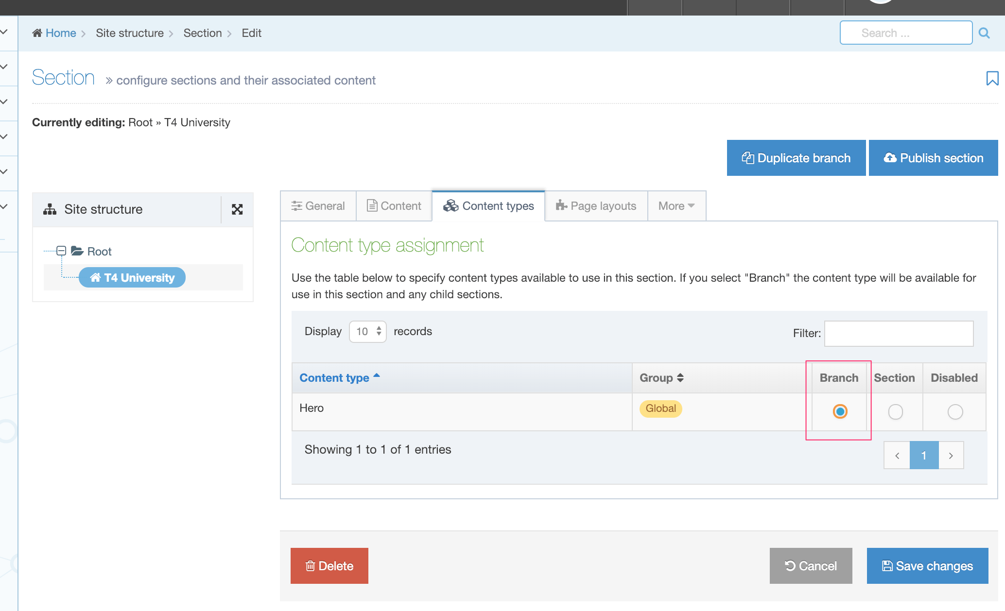 From the Section settings, select the Content Types tab and enable the "Hero" Content Type and click Save Changes: