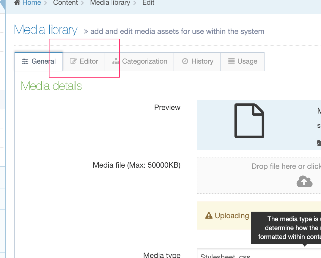 Got to Content > Media Library, navigate to the "css" folder and select the "Main Styles" file. Because we want to edit the stylesheet, select the Editor tab:
