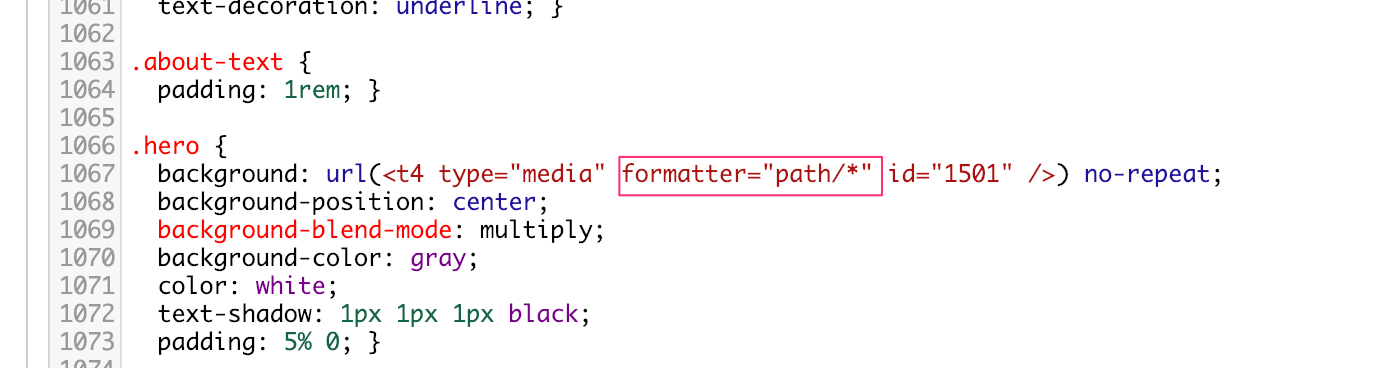 Scroll down until you see the ".hero" class – it’s down towards the end – and paste the T4 Tag into the background URL value to replace the image path.