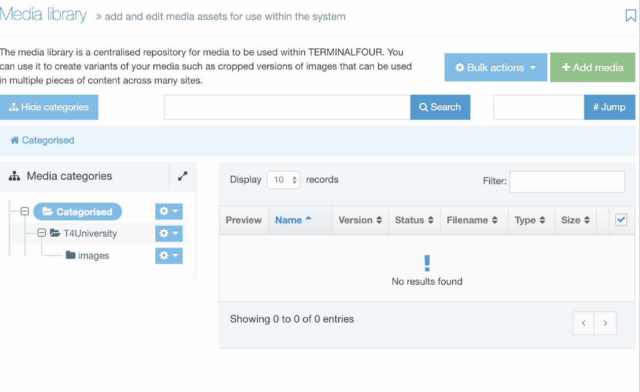 The first thing we are going to do is add the image, stylesheet and JavaScript files to Terminalfour. The Media Library is where you store the files used across your site.