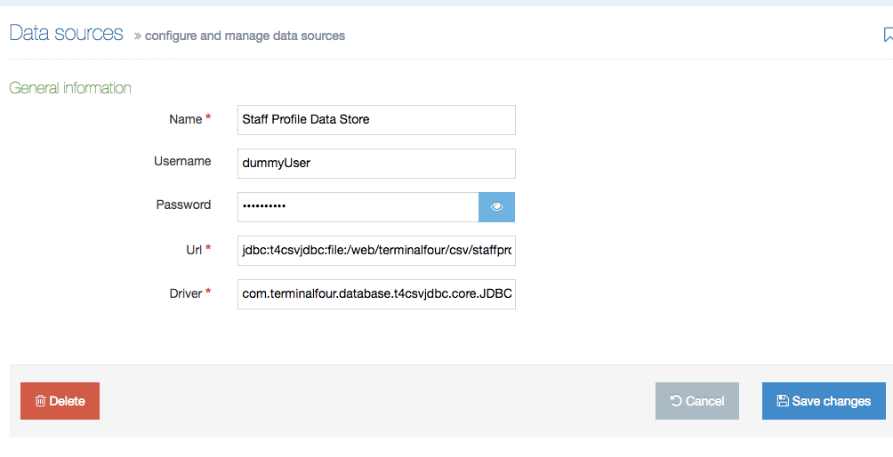 | URL | The url encoded URI at which the CSV file or directory of files is located. This must be a location accessible by the Terminalfour application. This can either point to the directory containing the CSV file, to the file itself or to an external address at which the file can be found. The correct prefix corresponding to the CSV driver must be used in front of the URI. This is Required. |