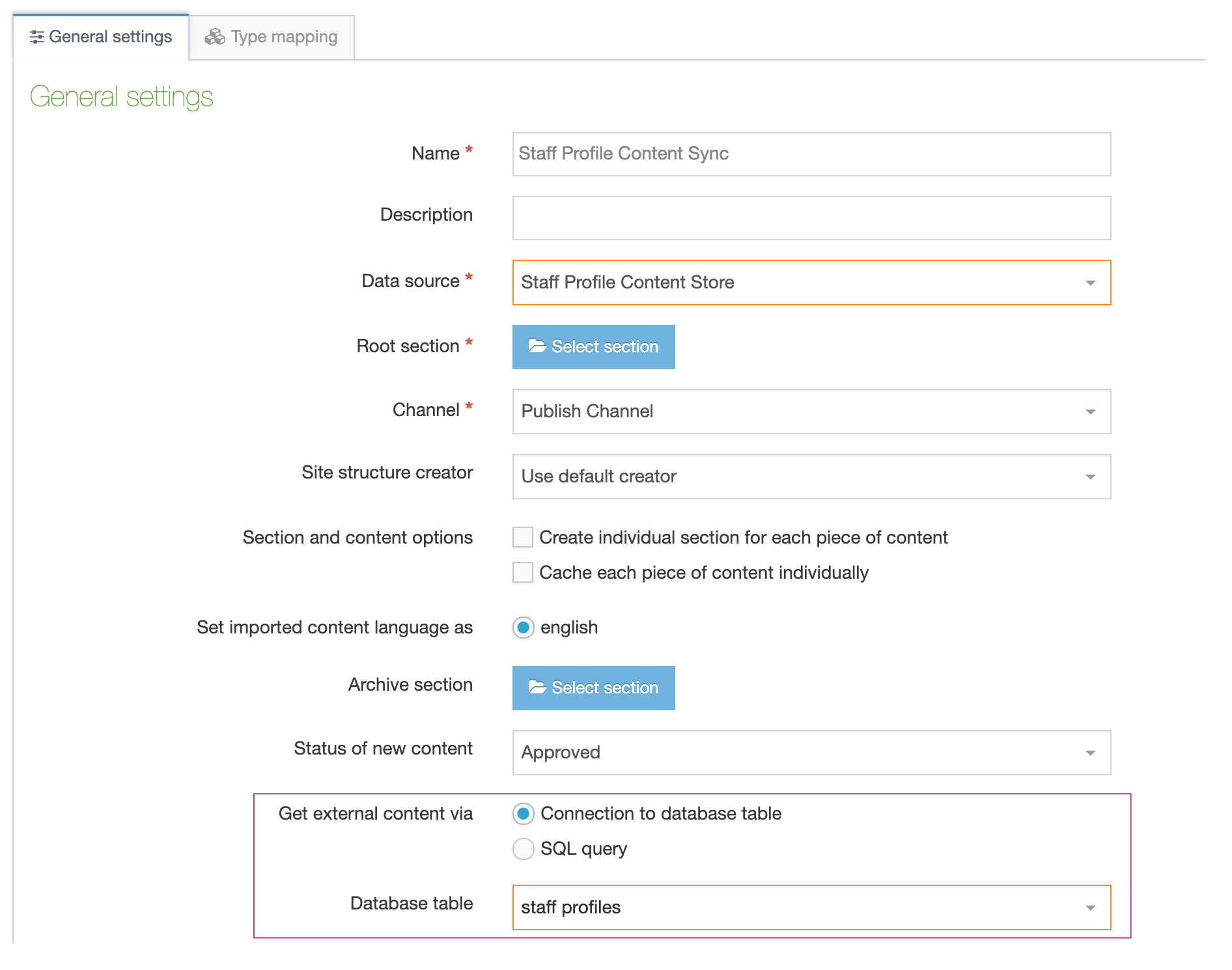 - Configure other options as appropriate (see documentation on the External Content Syncer for further information)
