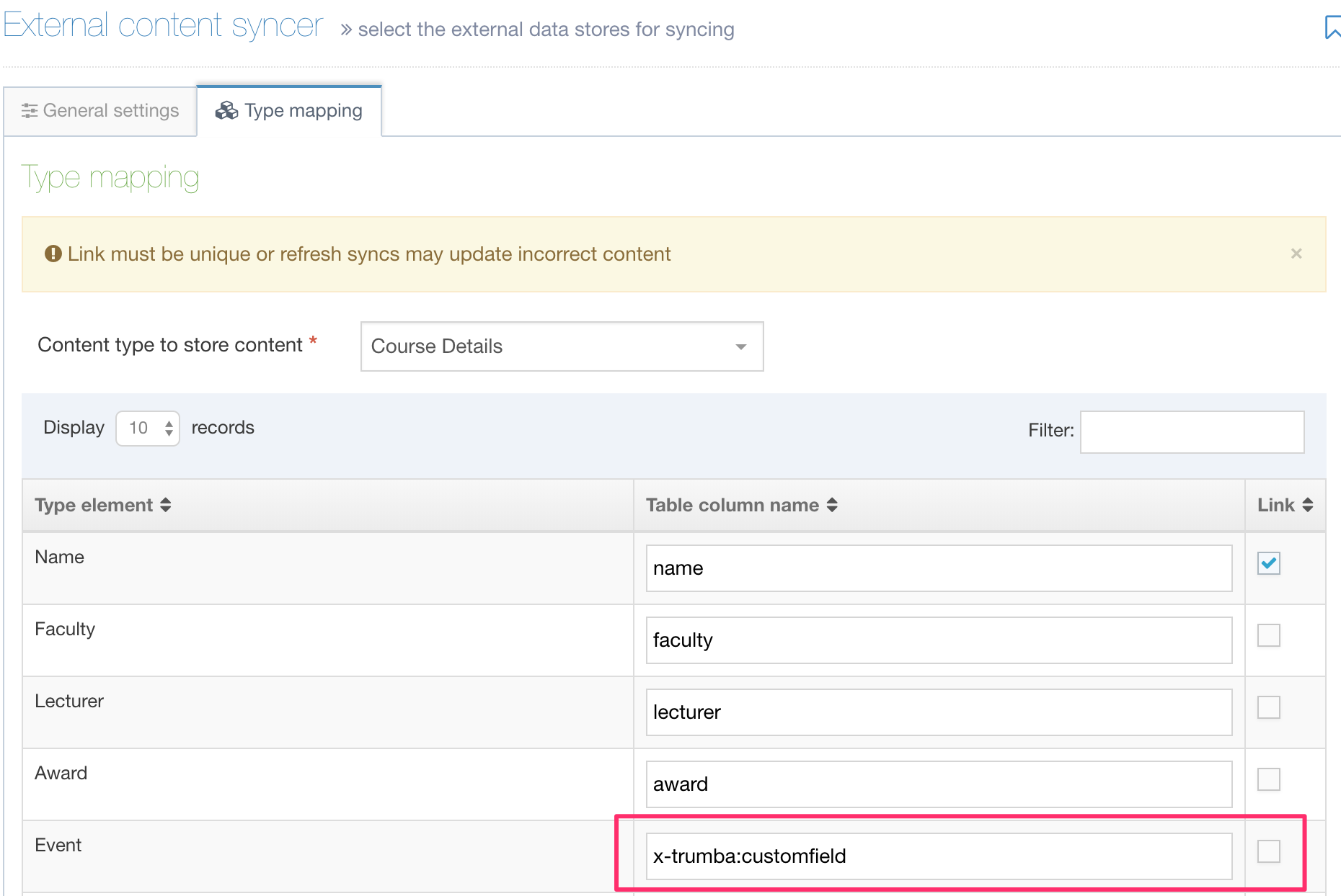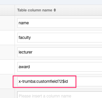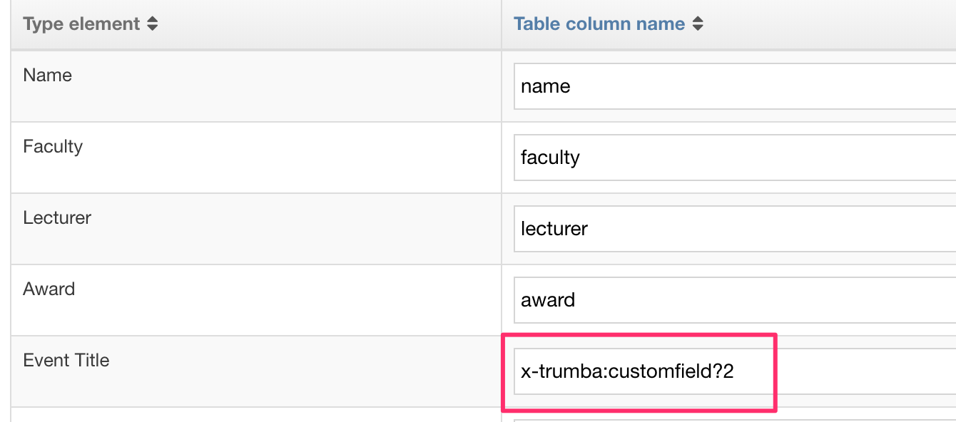 When mapping your types, you can enter x-trumba:customfield as the Table Column Name