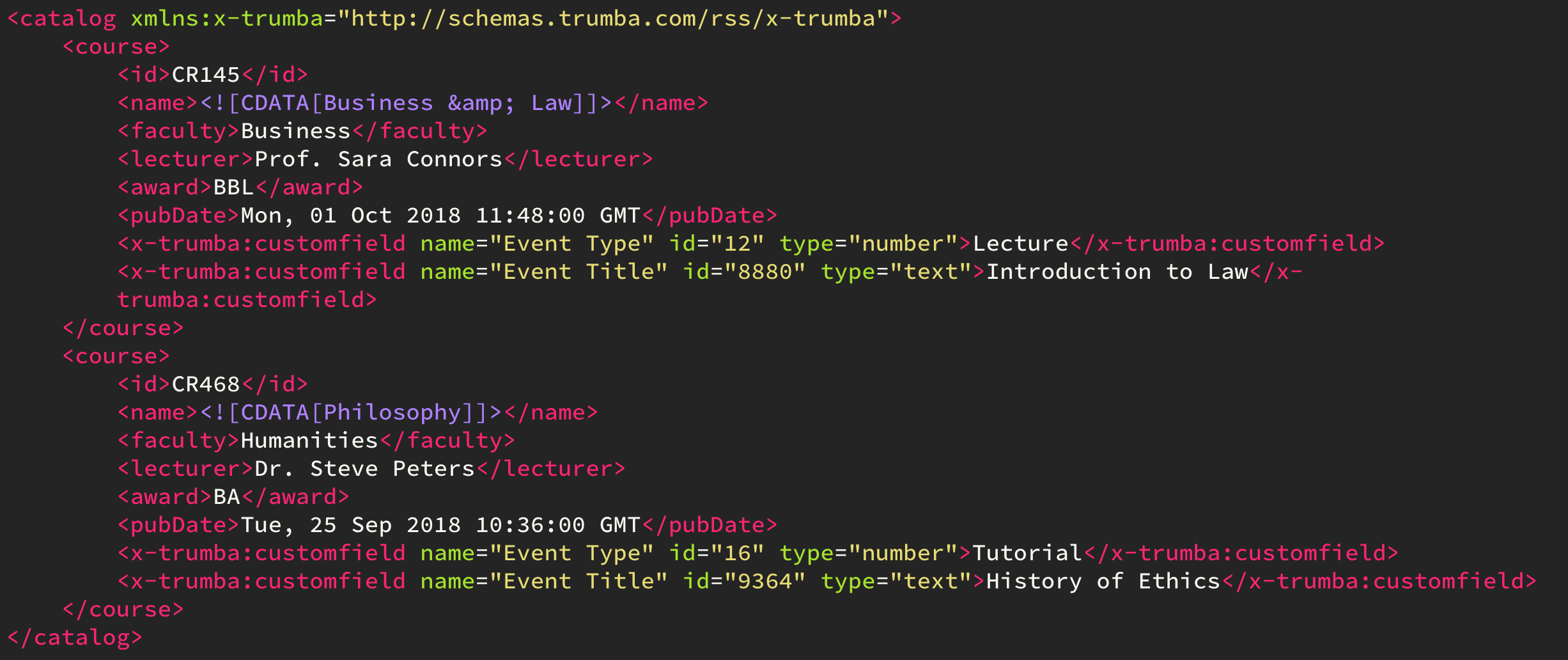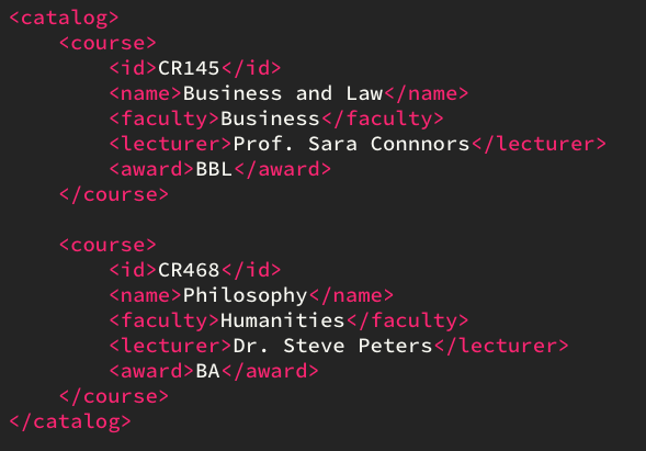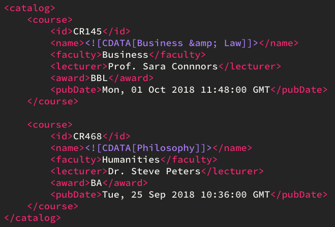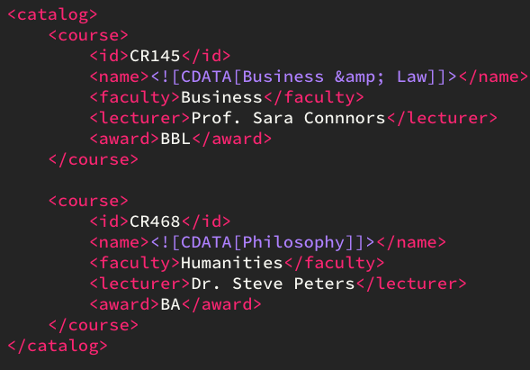 In this example, the course names use CDATA sections to prevent parsing of entities: