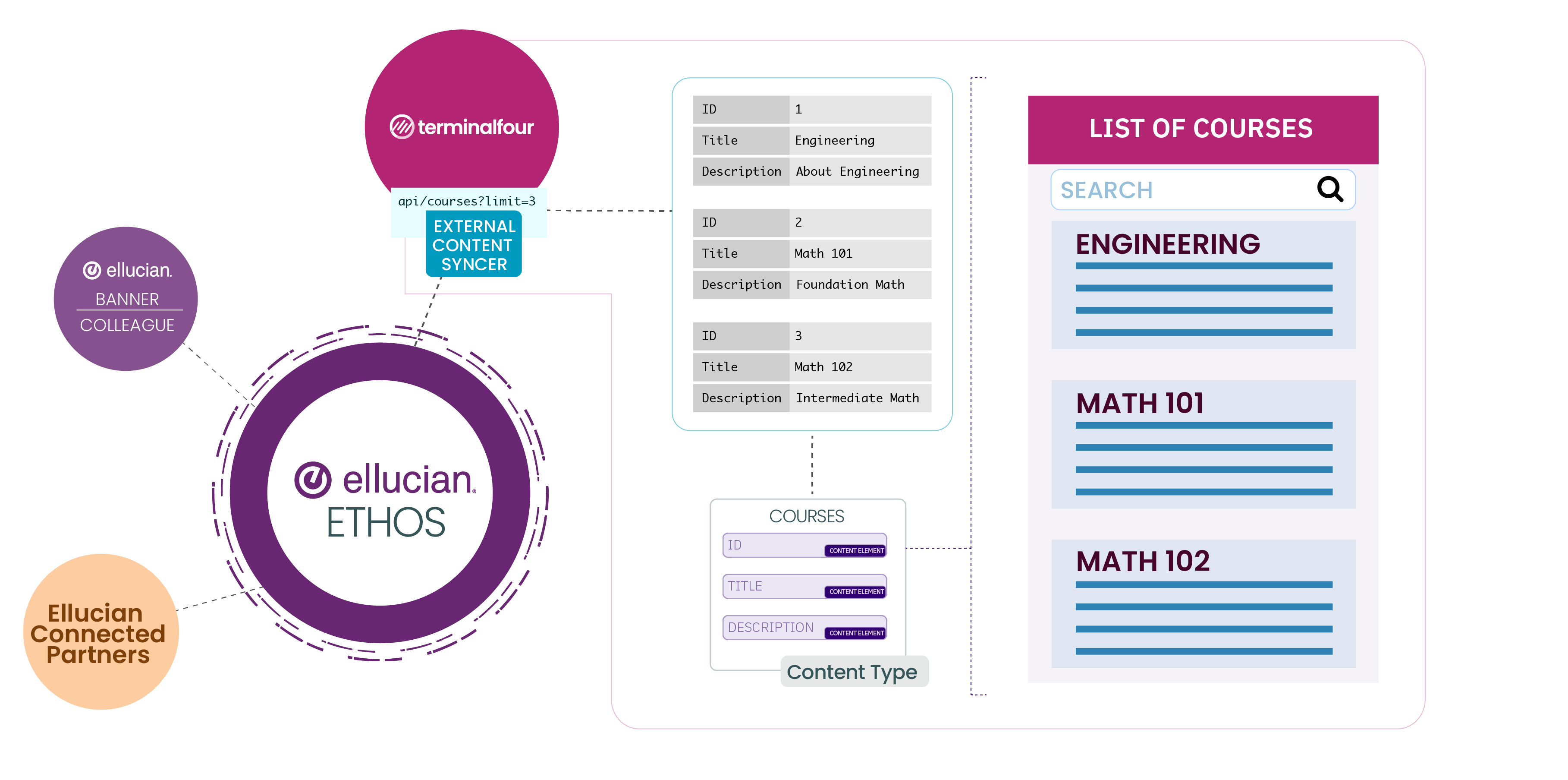 Terminalfour brings integration with Ellucian Ethos so you can ensure that academic and student information published on your website or portal is the same for everyone in and outside your organization. Use cases include powering website course/degree search or people finder features or showing content from Ellucian solutions on a staff or student portal.