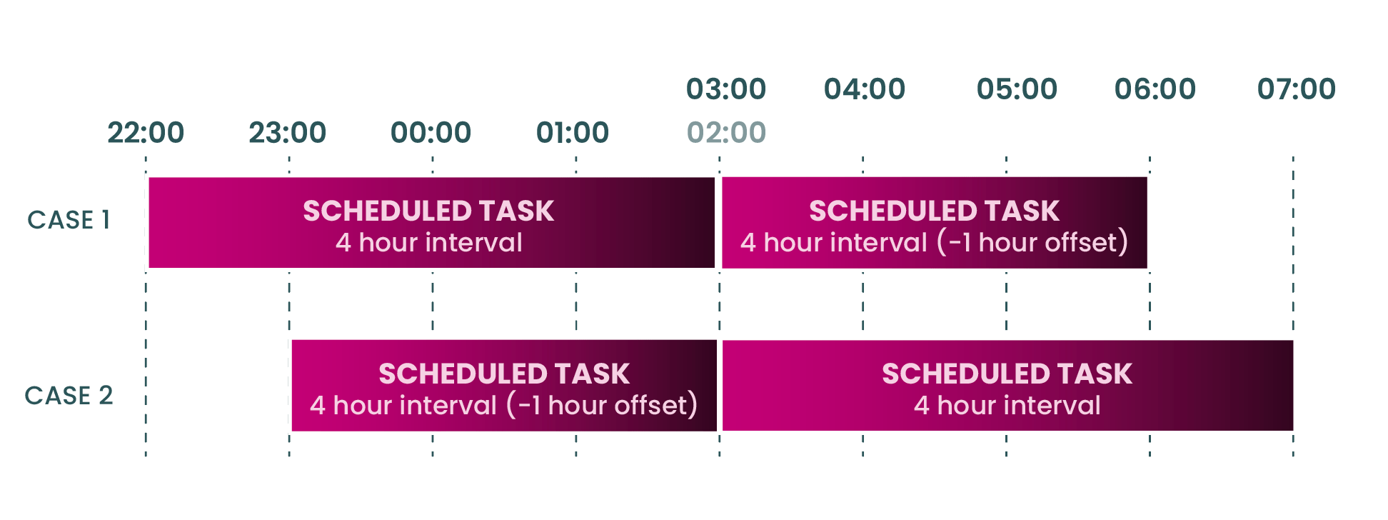 - There's a four-hour interval between the execution start and the next execution begins when the clock moves forward; in that case, the next interval is offset by minus 1 hour.