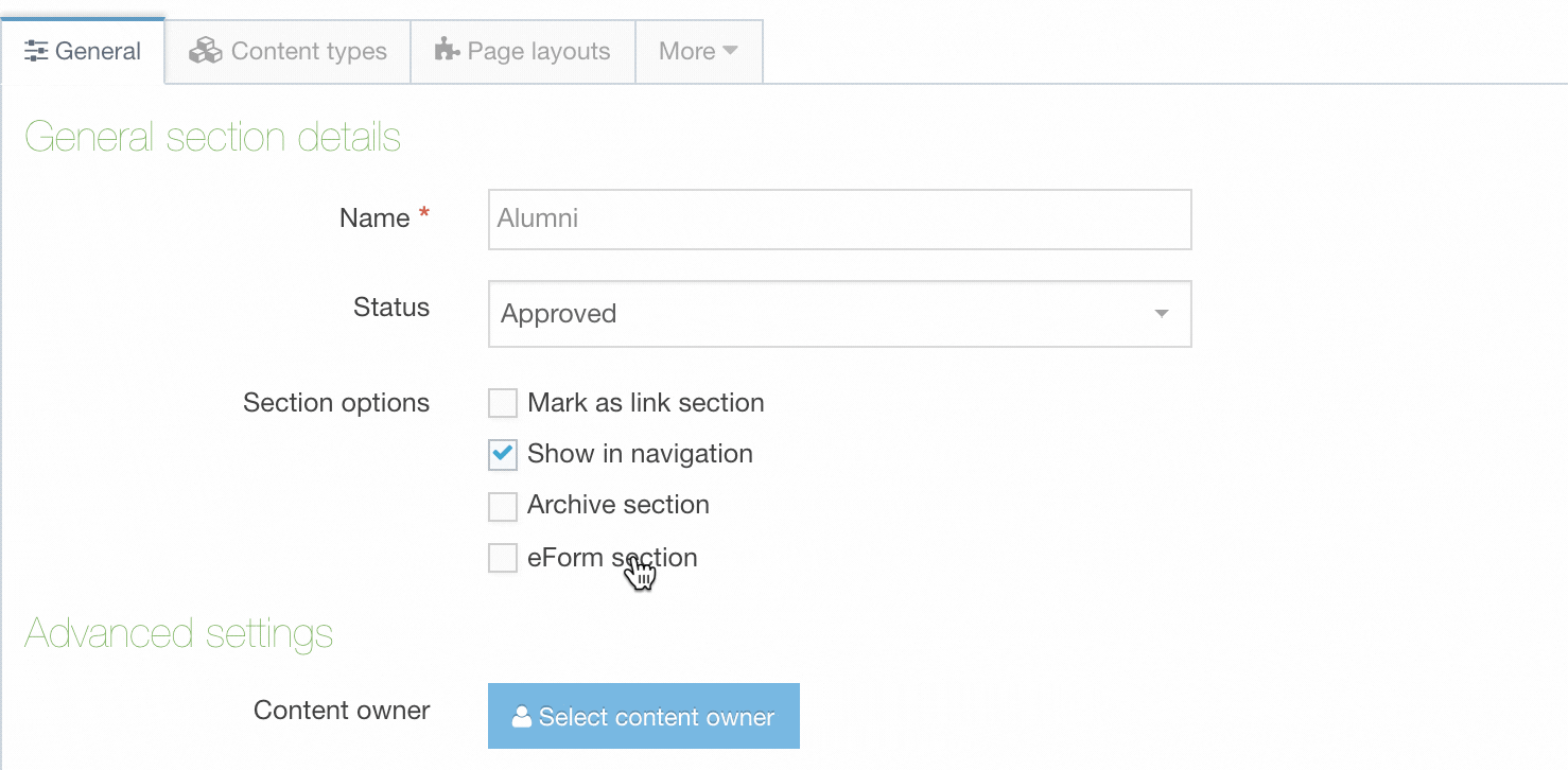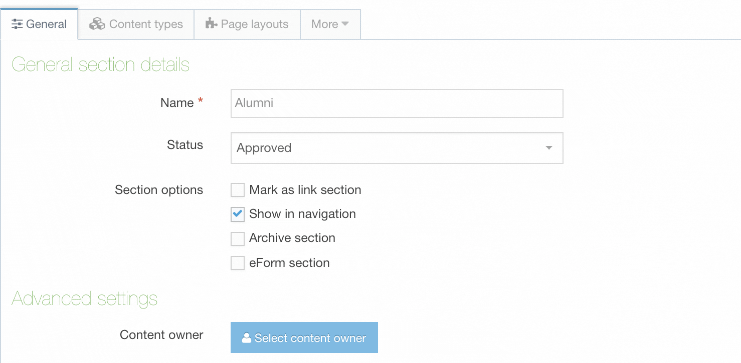 Alternatively, you can set the Section status to Approved but uncheck ‘Show in navigation’. This will publish the Section but it will not be linked to from any Navigation Object. This is often referred to as a Hidden Section. This approach should be used with caution because if a Section or content links to a page within the Section, the link will be published and users can navigate to it. Since the Section is published on the web search engines may index the pages unless explicitly directed otherwise.