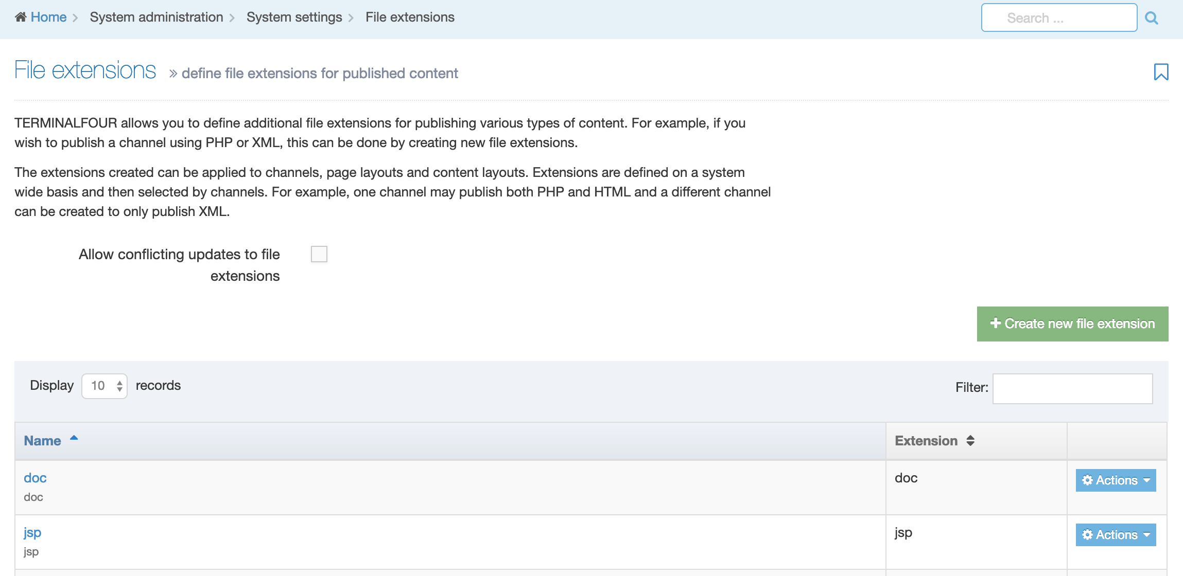 Terminalfour comes with several pre-loaded file extensions for use in the system. These file extensions are used by a Channel when publishing a site.