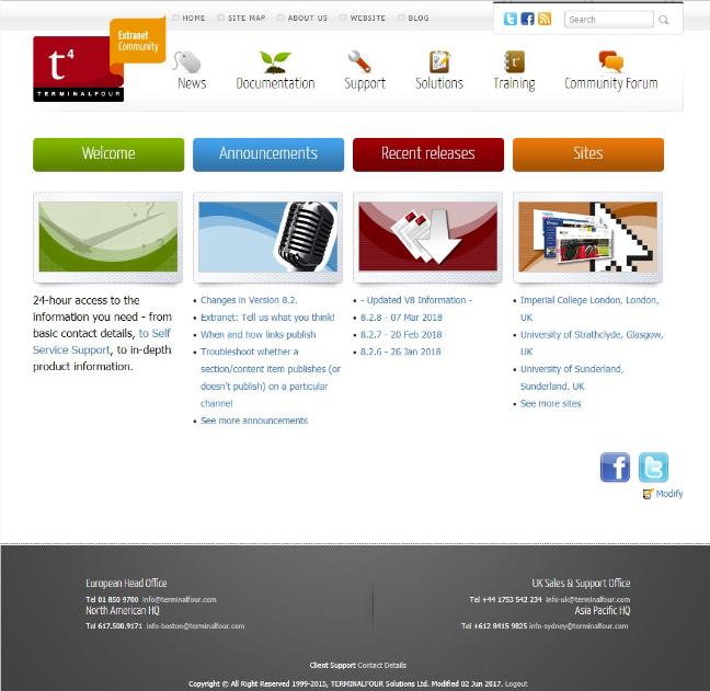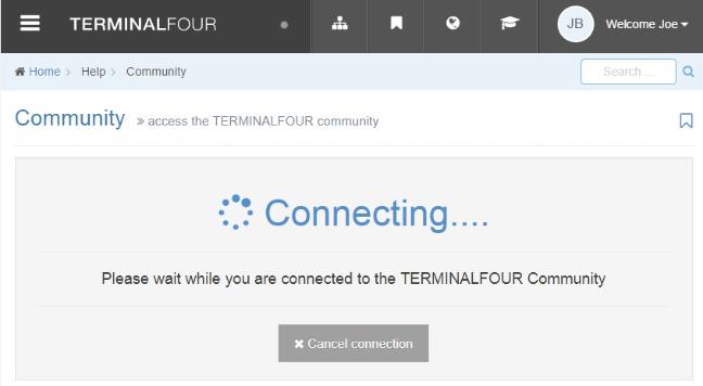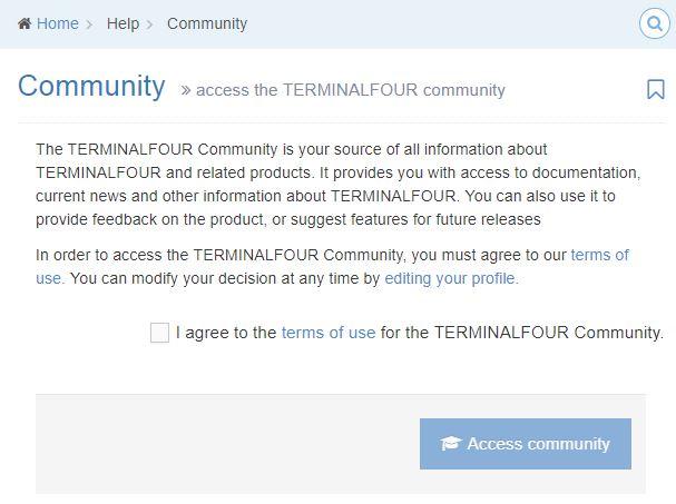 The TERMINALFOUR Community is your source of all information about TERMINALFOUR and related products. It provides you with access to documentation, current news and other information about TERMINALFOUR. You can also use it to provide feedback on the product, or suggest features for future releases.