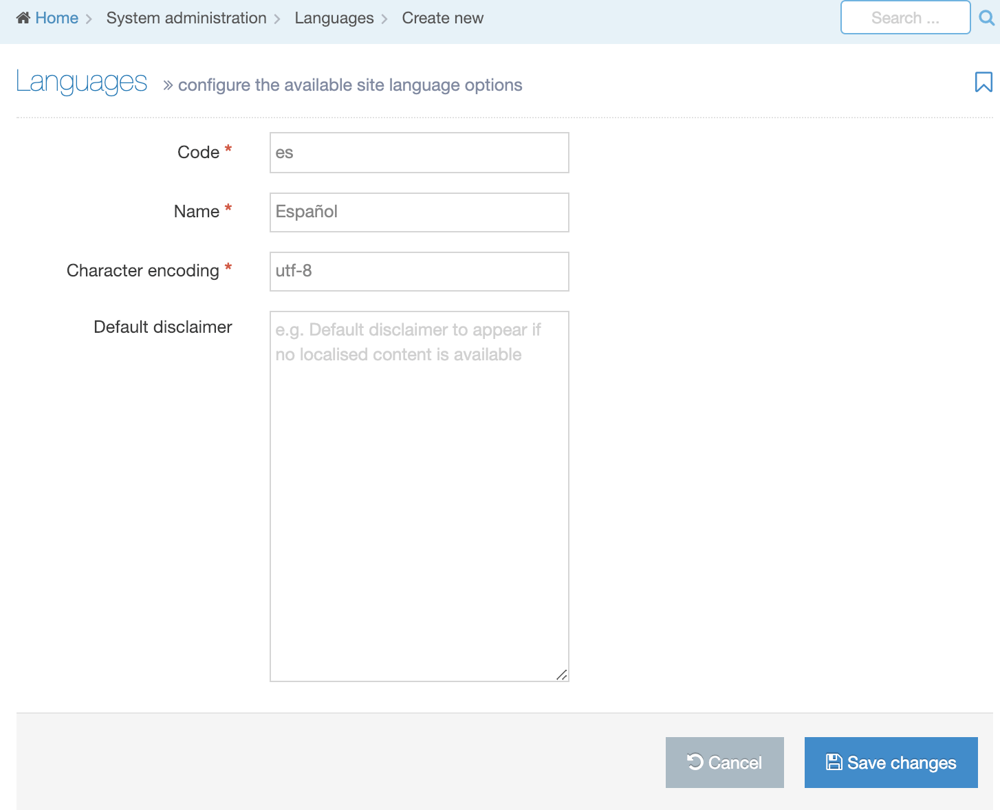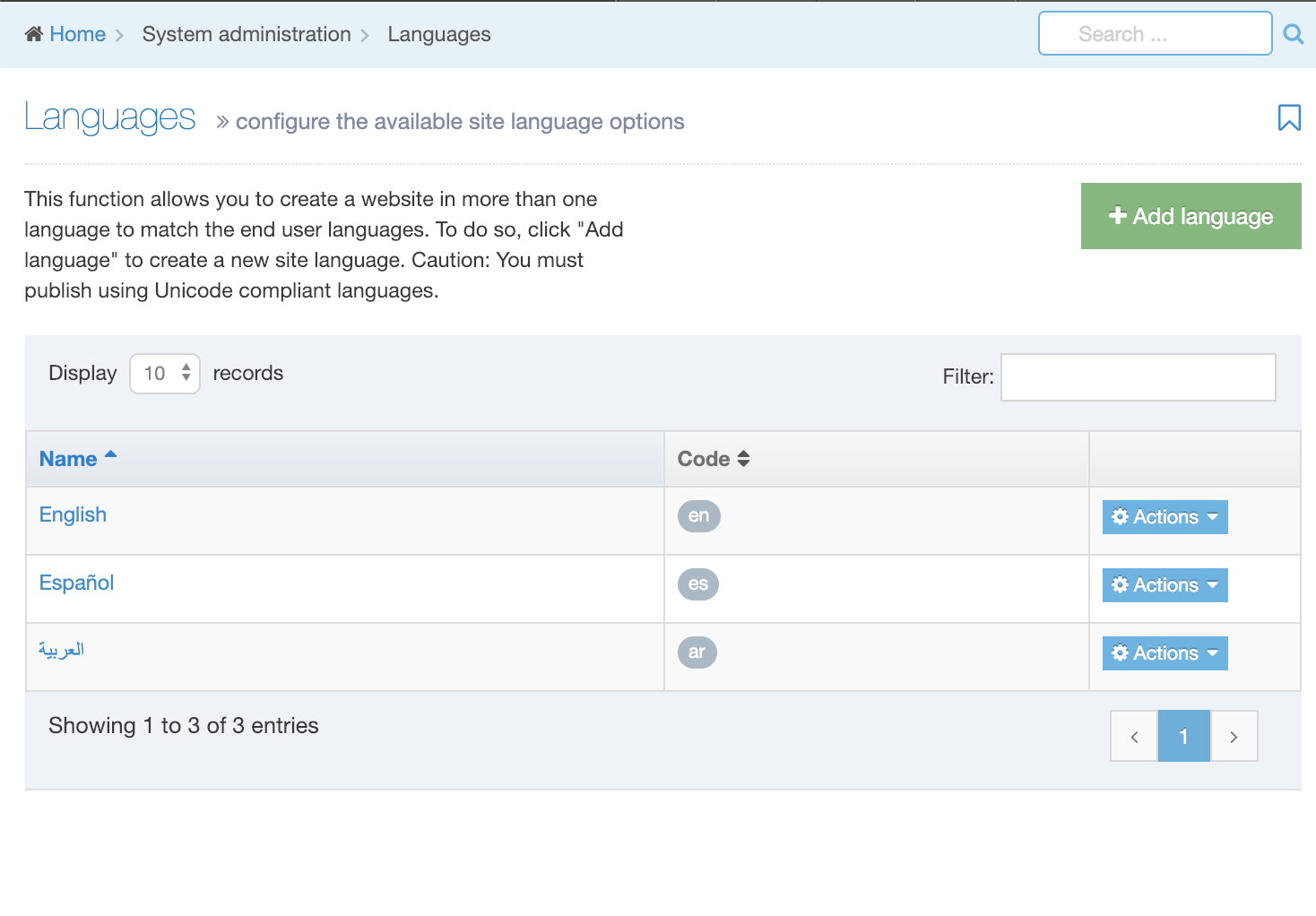 To configure the languages, go to System Administration > Languages. This opens the screen shown below: