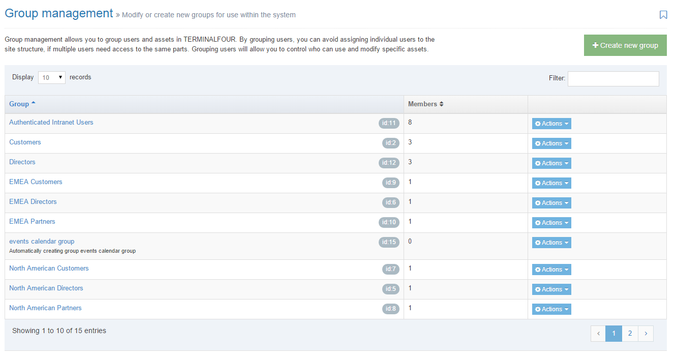 - Delete: The Group is removed from TERMINALFOUR. When deleting a Group, only the Group is deleted; Assets and Users within the Group are not deleted. Assets that were owned by the Group will become Global Assets.