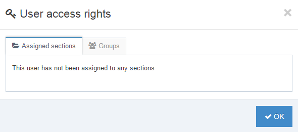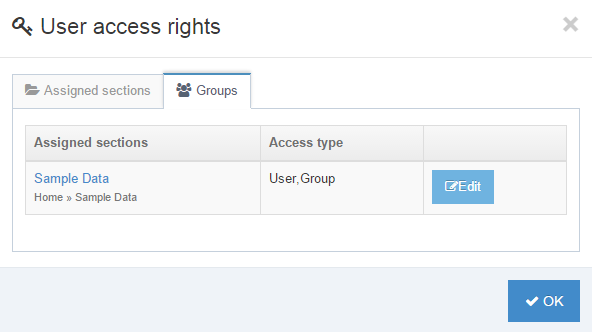 The term Access rights includes Assigned sections and Groups. When you click Access rights the screen shown below appears: