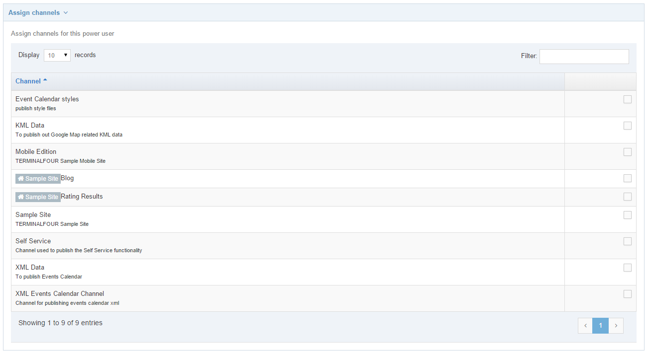 When the user is designated a Power user or Moderator then the user is permitted to publish specific Channels, or micro sites, or both. This enables the User to run a manual publish of the selected Channels or microsites. Make the appropriate selections and then proceed to Community access.
