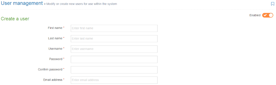 To modify or create new Users for use within the system, go to System administration > User rights & roles > User management