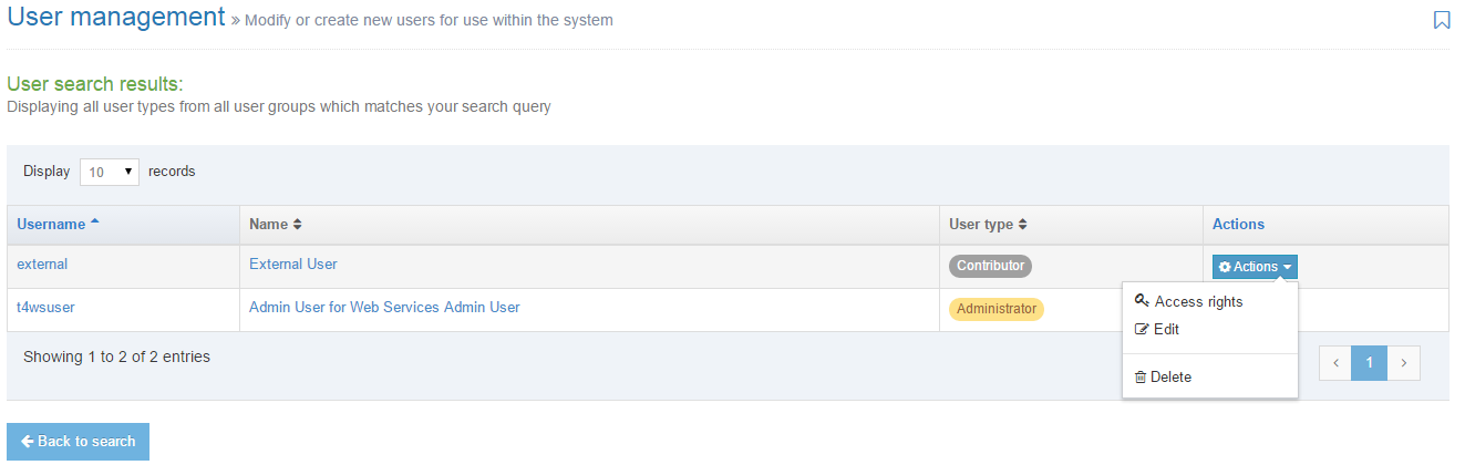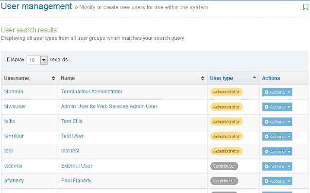 This presents the Username, Name, User type and an Actions button. In this example you can see the options you have if you click the Actions button.