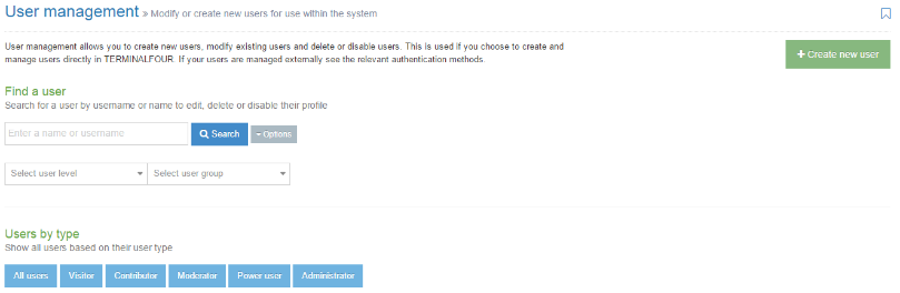 You have several options to choose from this starting point. The Search functions lets you enter a name or username to fetch their records. There are two search box options - Select user level and Select user group. These serve as short cut methods for these categories. If you wish to see the Users by type - you can click any of the blue tabs, including the first on the far left that enables you to see all users. To create a new user, click the Create new user button.