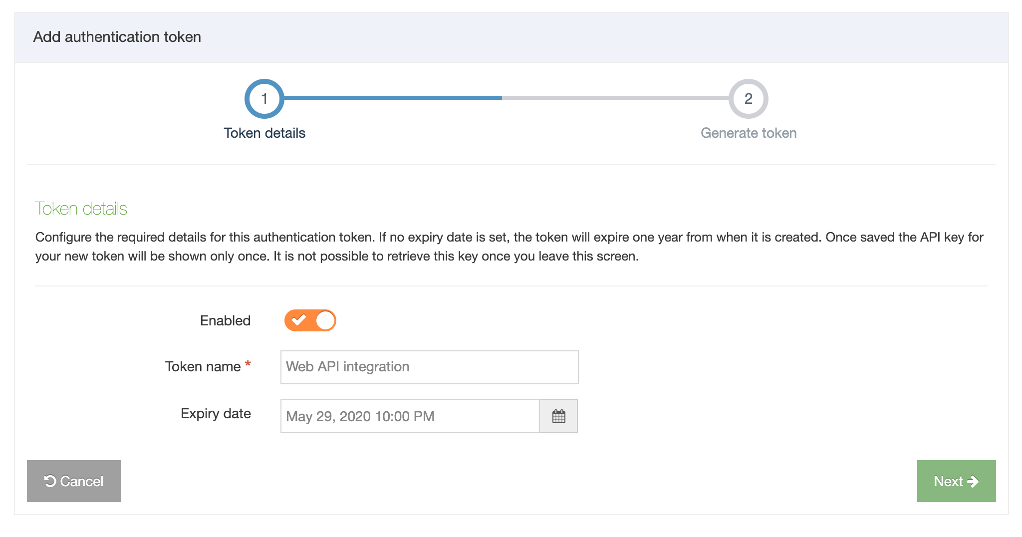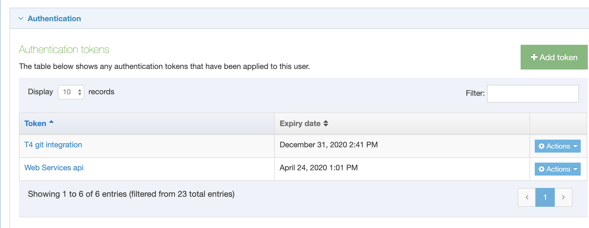 Authentication Tokens From Version 8.3.4 Administrators can create authentication tokens to use with third-party applications via the Web API. |
