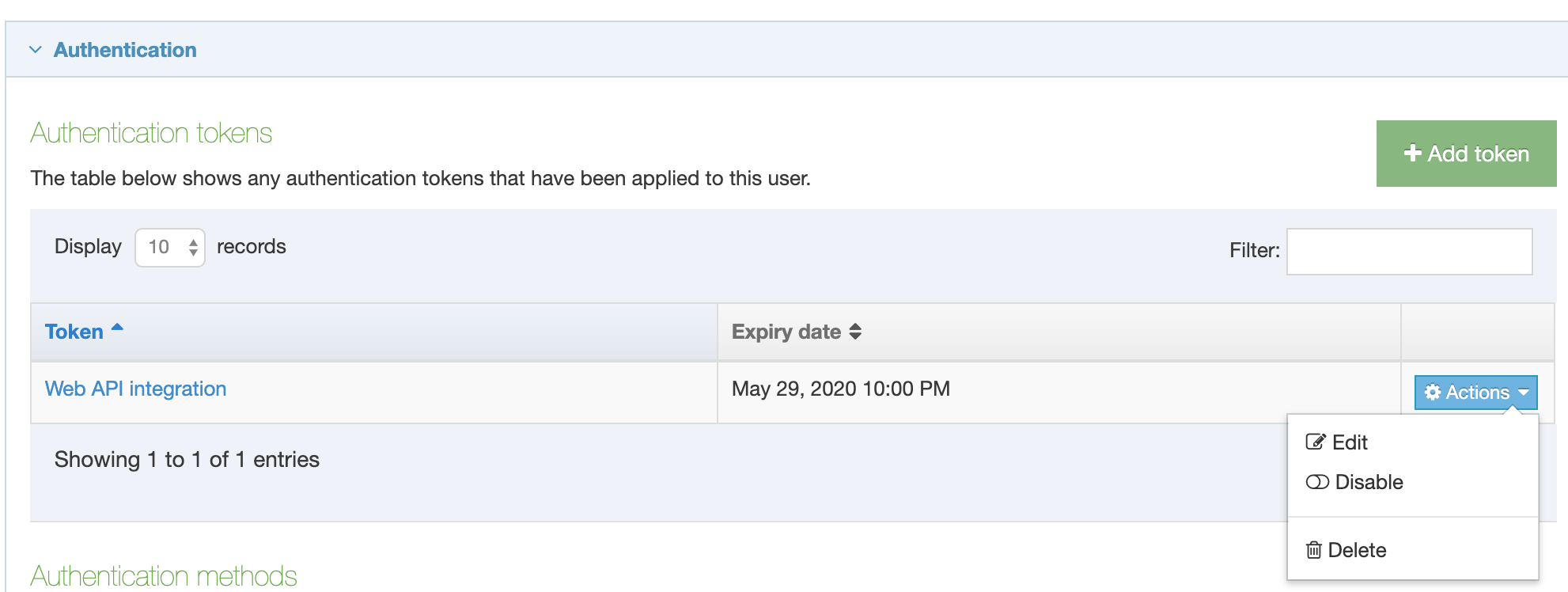Tokens can be disabled and deleted from the Actions menu. The Edit option permits a user to rename or disable a token.