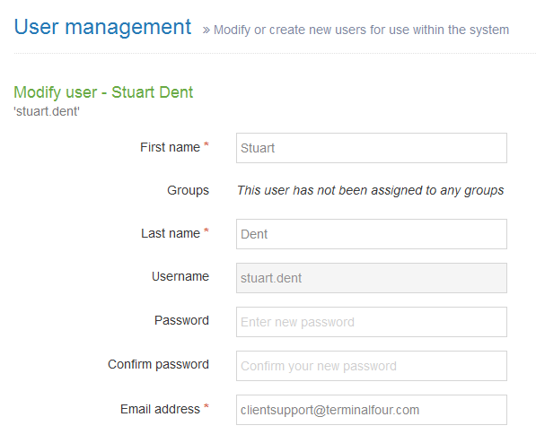 | User type | Sets the user level. This restricts access to parts of Terminalfour based on the user level |
