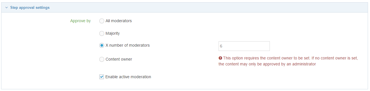 If the Enable active moderation option is checked, combined with X number of moderators, once the set number of approvals or rejections are reached, ultimately meaning that content can never be approved (because too many users have rejected it), the content is considered to be rejected. We recommend that this option is checked (if using x number of moderators).