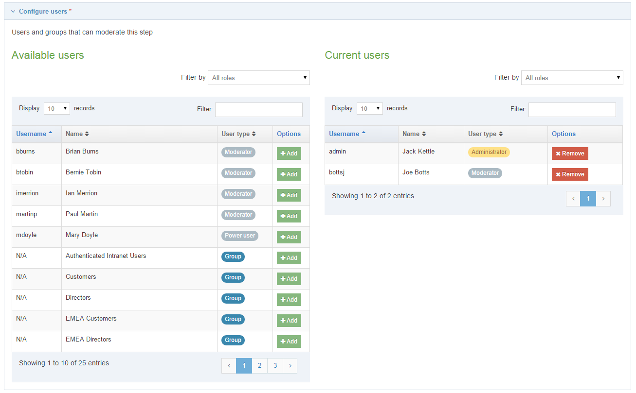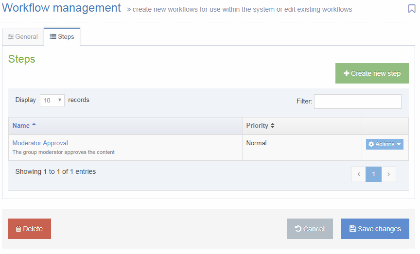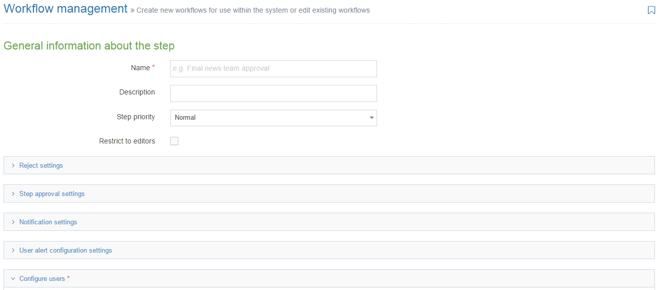 - Step moderators: the user(s) who can approve the content. This is required if the step approvers are to receive email alerts of new content, but will result in content rejection emails not being sent to the content editors.