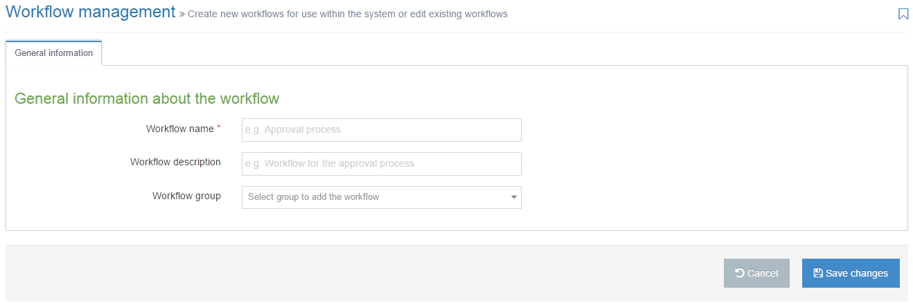 Select a Group for this Workflow. Grouping Workflows restricts the users that can use or edit the Workflow. It is good practice to add all your assets to Groups. This makes it easier to identify which assets are being used and where. By grouping assets together, you can also restrict access to them. When a user is not part of the Group, they cannot see or access assets in that Group. |