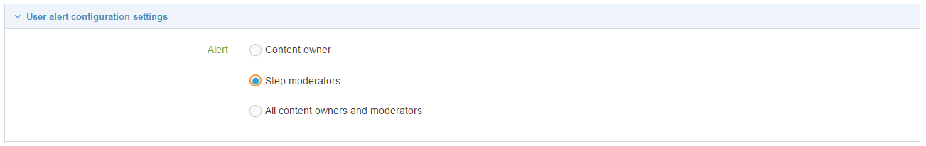 - Content owner: the user who submitted the content for approval. This is required if the content editors are to receive email alerts of rejected content, but cannot be used if Step moderators need email notifications for content awaiting approval.