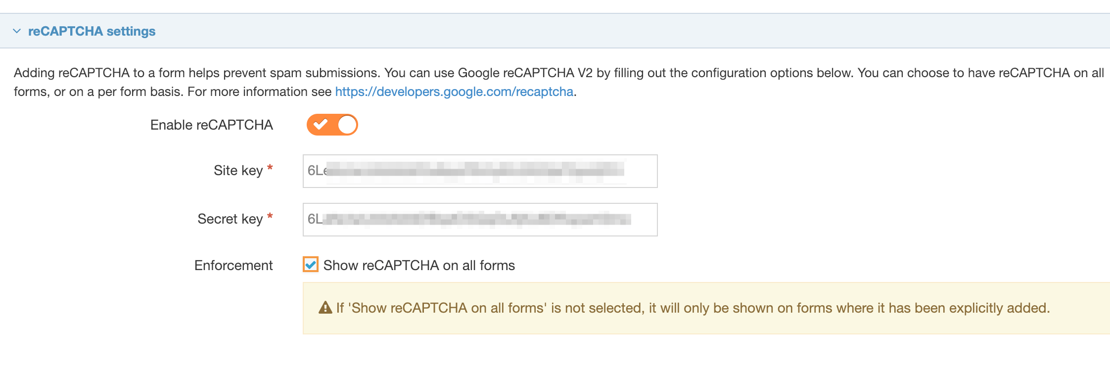 Use the switch to enable reCAPTCHA across your site(s). When reCAPTCHA is enabled in the settings, a reCAPTCHA option will be available in Form Builder under Advanced Inputs. Paste the Site and Secret keys into the text boxes.