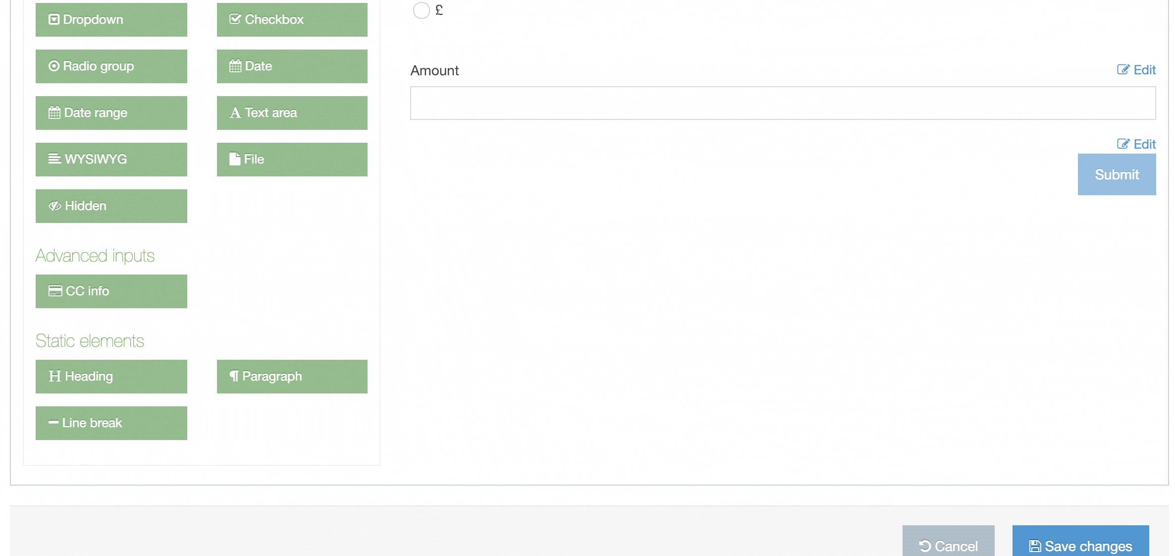 When a payment gateway has been set up, a CC Info field will display in Form Builder below the Advanced inputs heading: