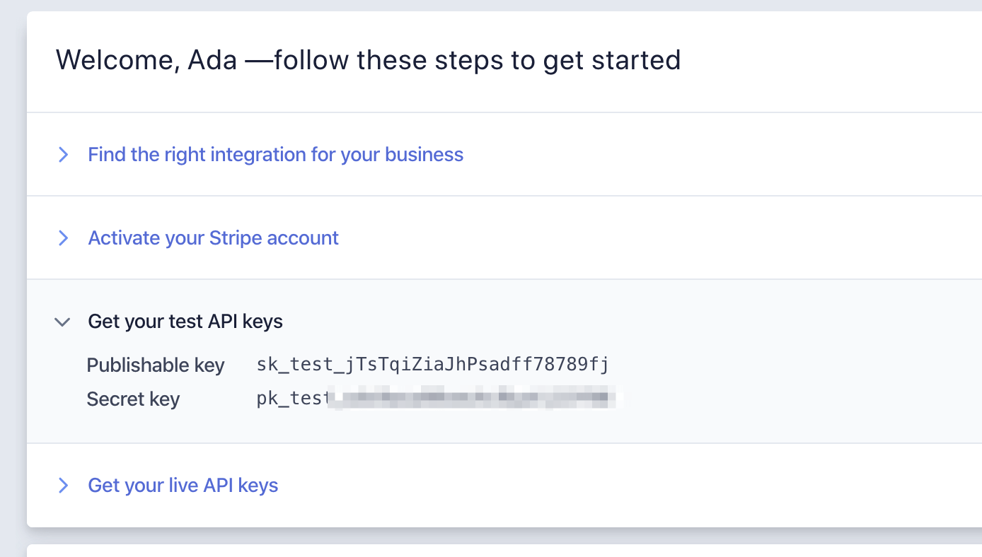 You'll need a Stripe account to login to the dashboard. From here, you can get the Publishable and Secret keys to set up your Payment Gateway profile. Select a key to copy it to your clipboard. In this example the test API keys are displayed: