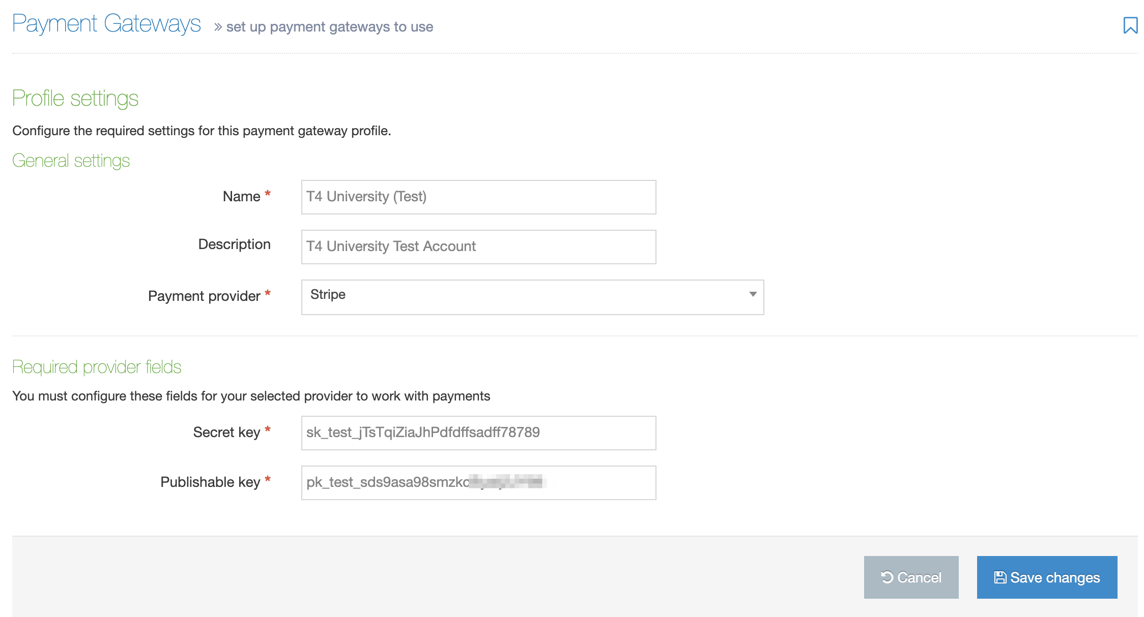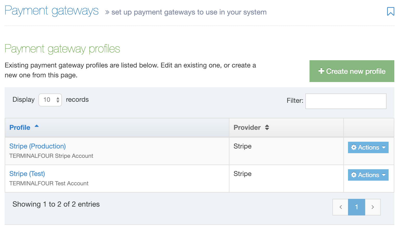 In this example, two gateway profiles – "Test" (using the Stripe test API key) and "Production" (using the Stripe live key) have been set up: