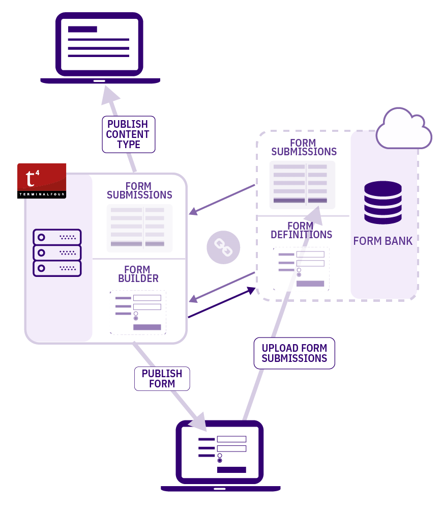 When the keys are exchanged a token is generated on the Form Bank server, encrypted using the public key and sent back to Terminalfour. Terminalfour decrypts this token and this is then used for between Terminalfour and the Form Bank. A new token is generated at ongoing intervals.
