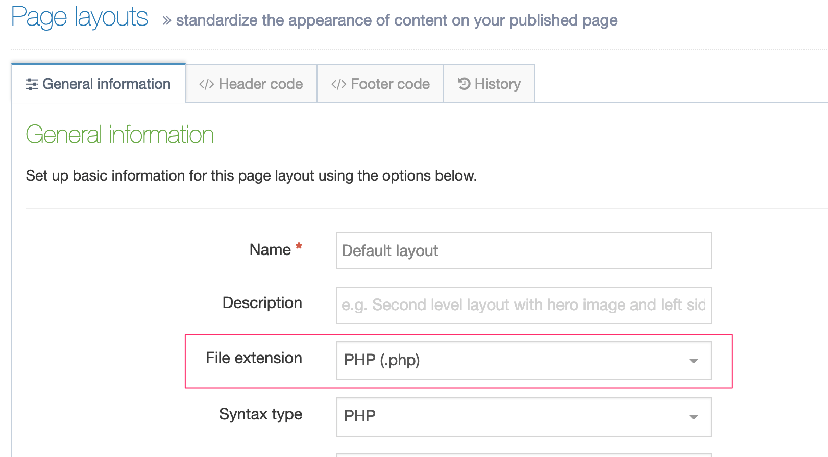 - Edit the Page Layout which is currently enabled on the Section, for example, "About us". Copy the header and footer code and paste this into a new Page Layout.