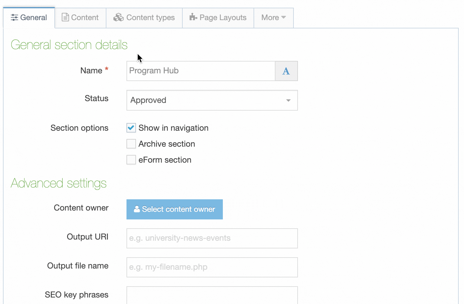 | Code After Section | The code that is output after a Section is published (if any). |