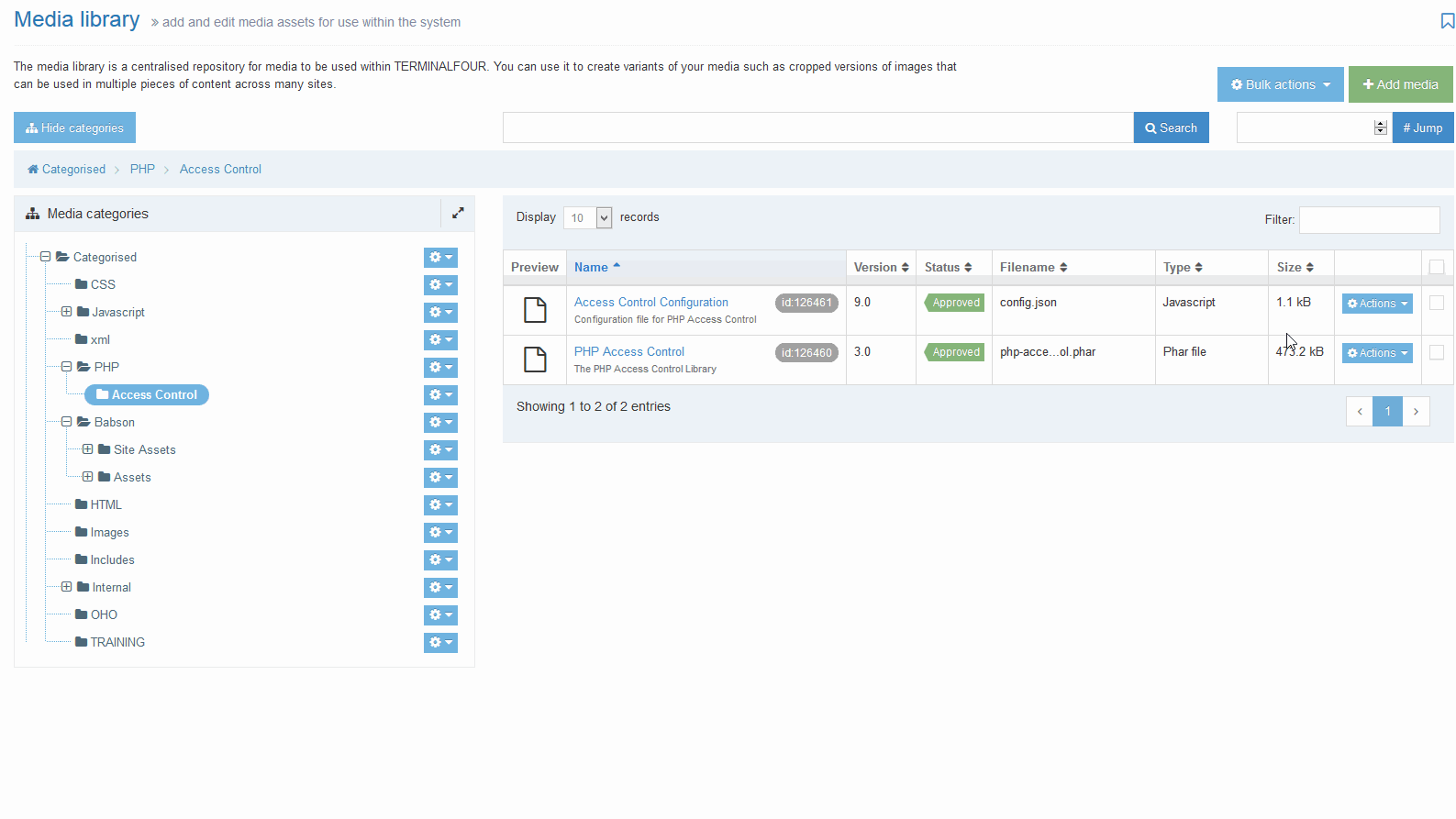 When you have installed the PHP Access Control module, you can configure the default settings. The PHP Access Control Configuration is a JSON file that's located in the Media Library. The Media Category that it uses will have been chosen on installation. Omitted configurable options will revert to the default values that are documented below.