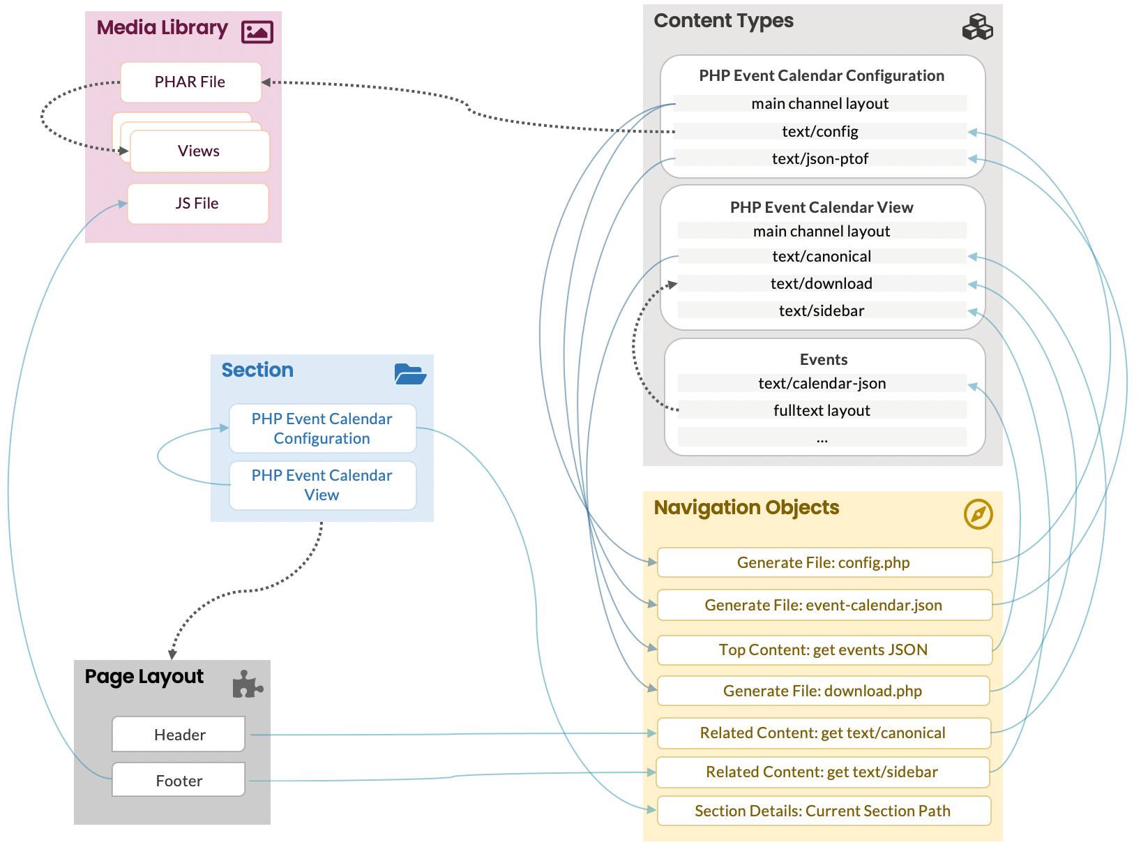 The main calendar page is made up of the following Content Items, using these different Content Types: