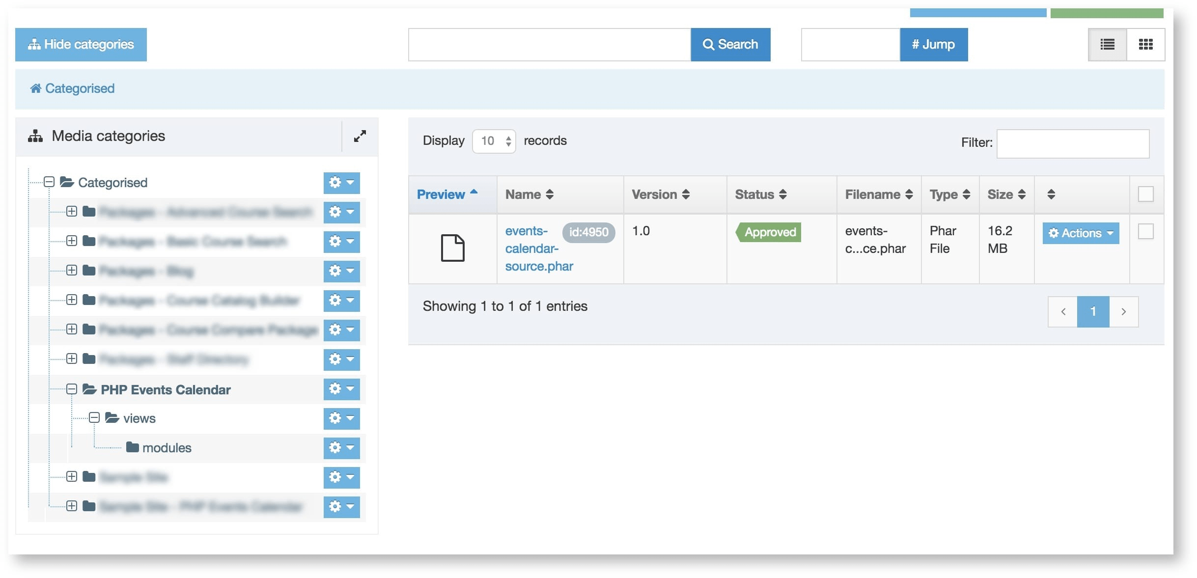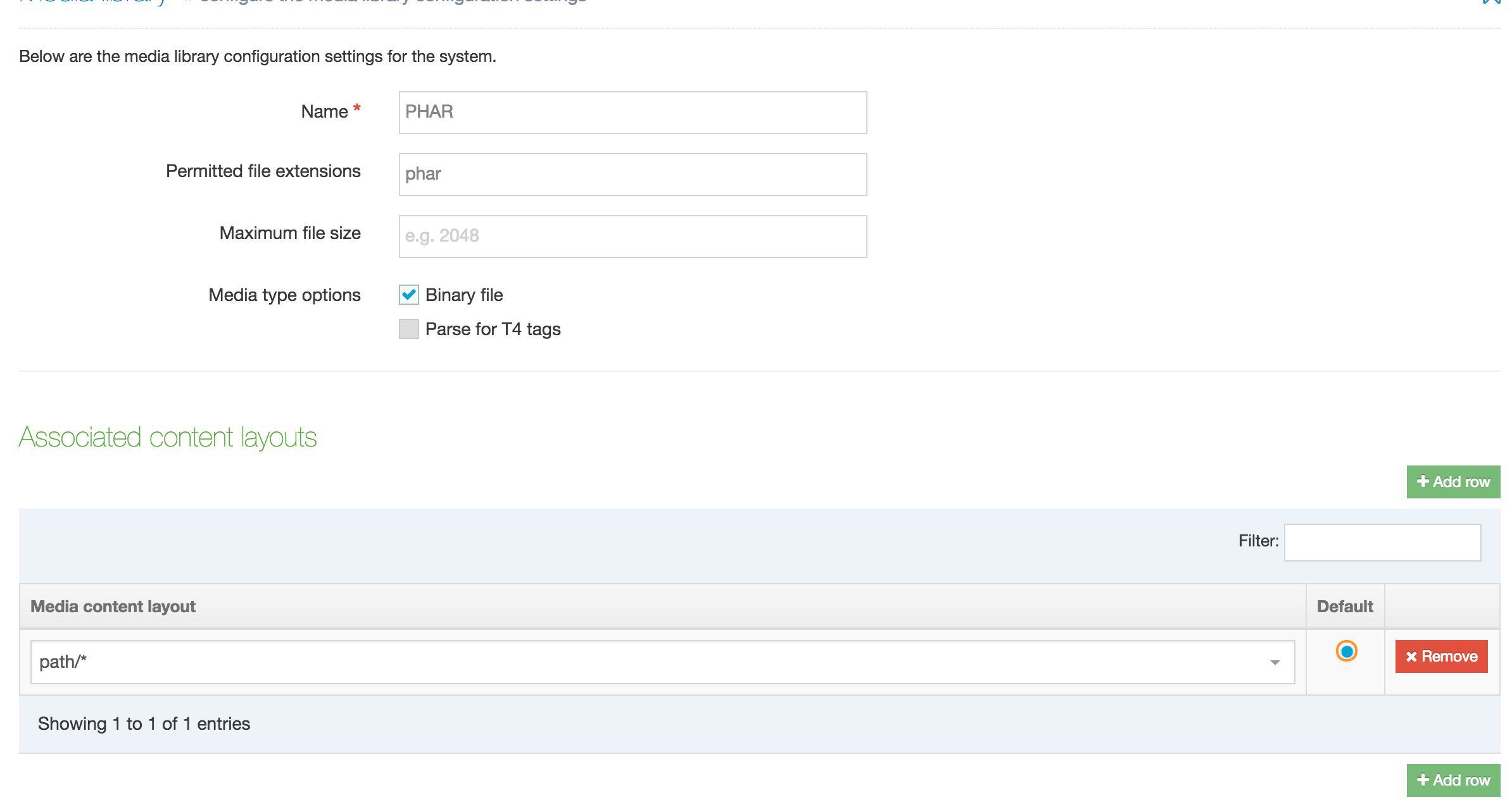 The PHAR file, a PHP Main Library archive, and the list of views are managed within the Media Library.