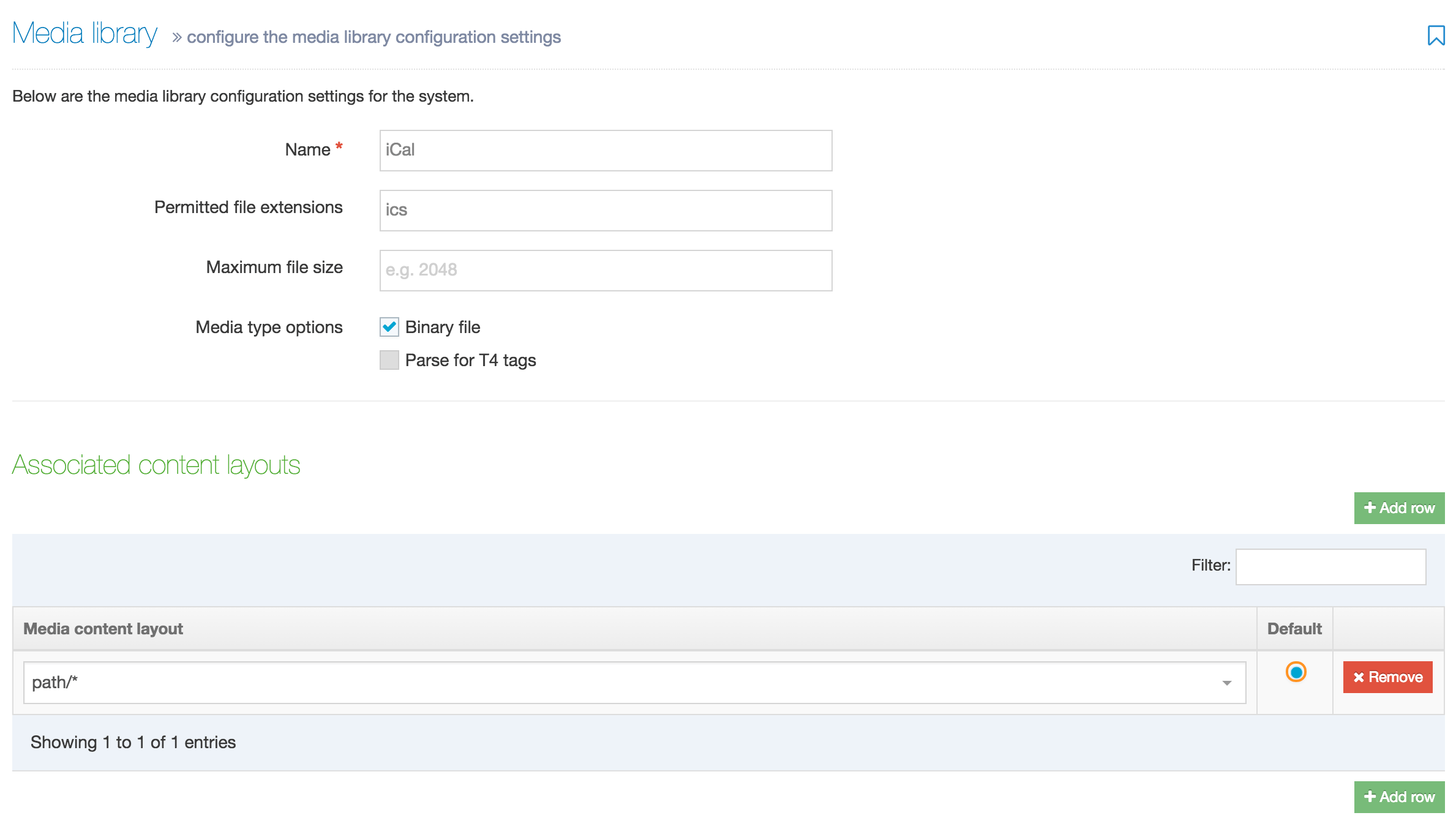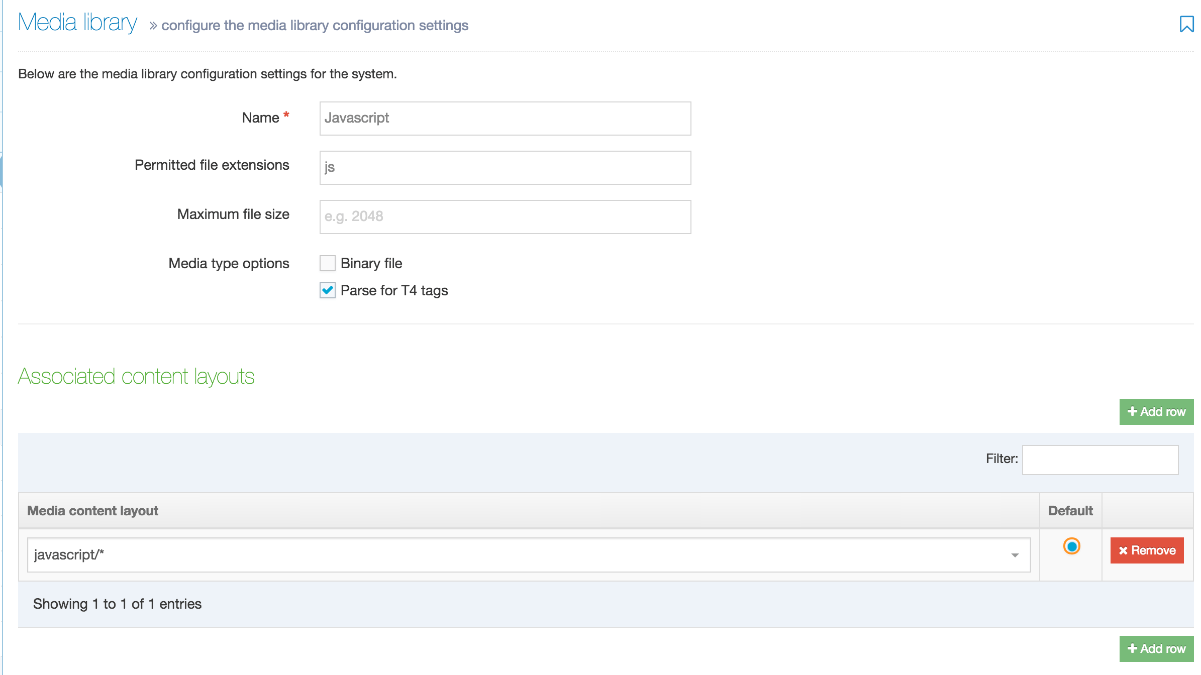 If it does not already exist, add another Content Layout to the Media System Content Type named "javascript/*". In the Content Layout code field add the following: